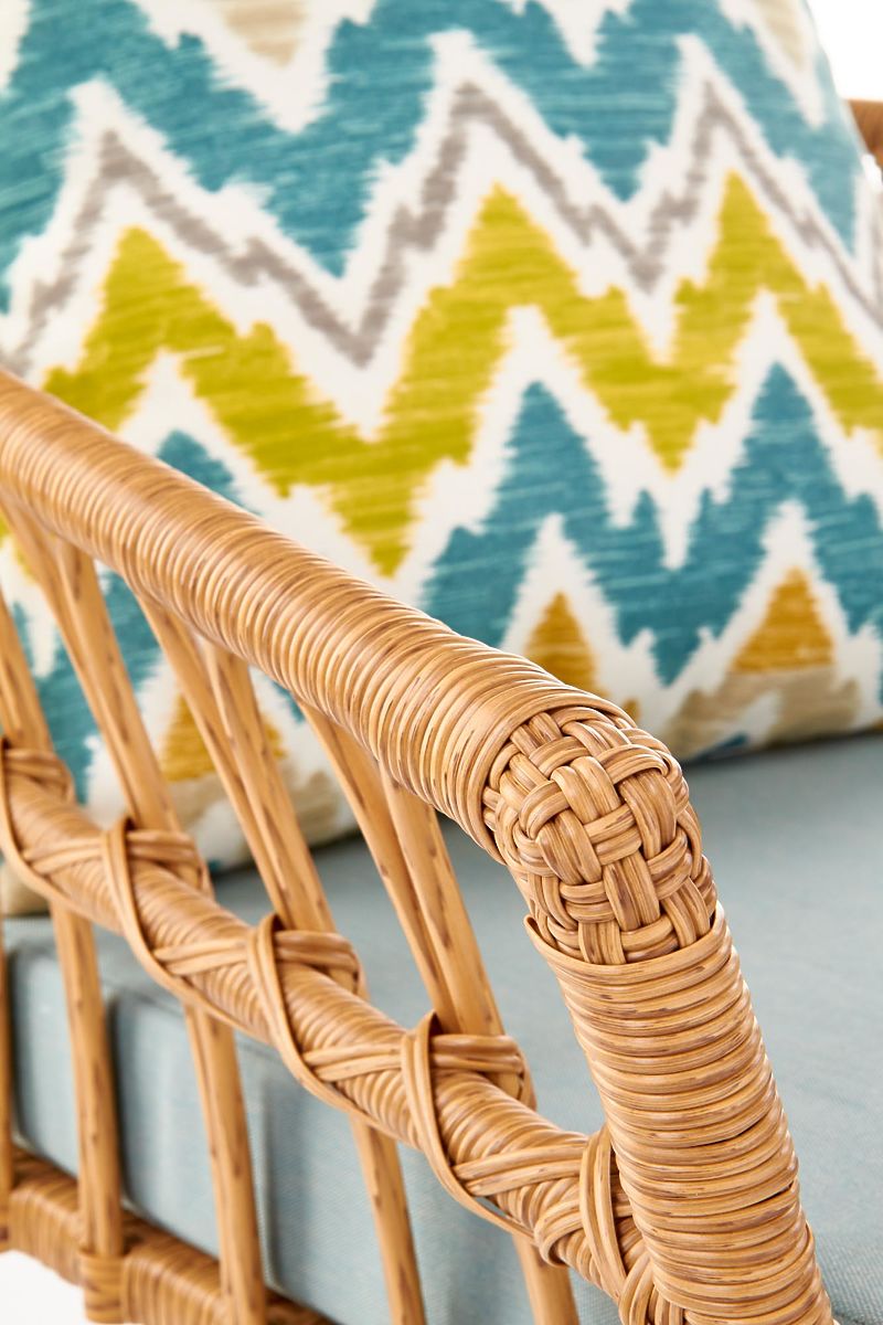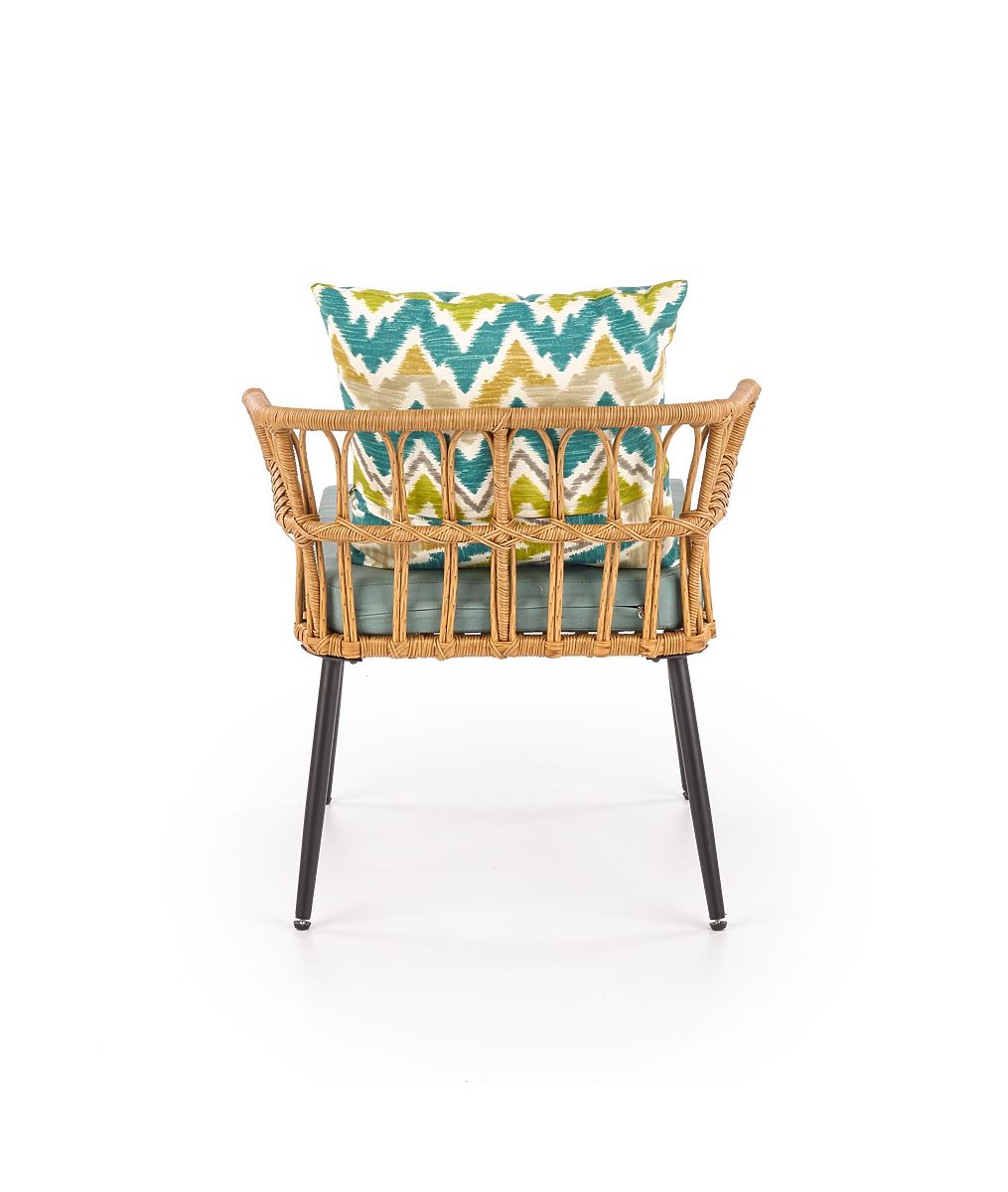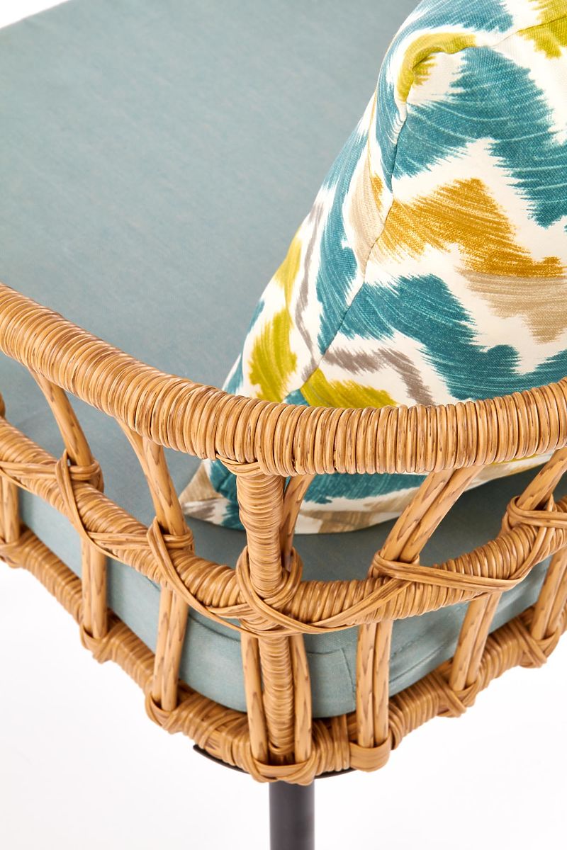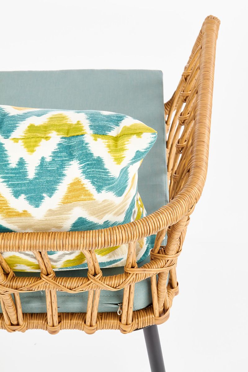 Stabilnú konštrukciu tvorí práškovo lakovaná oceľ v čiernej farbe, ktorá je prepletená syntetickým ratanom. Pre Vaše pohodlie je súčasťou balenia mäkký látkový sedák a farebný vankúš.