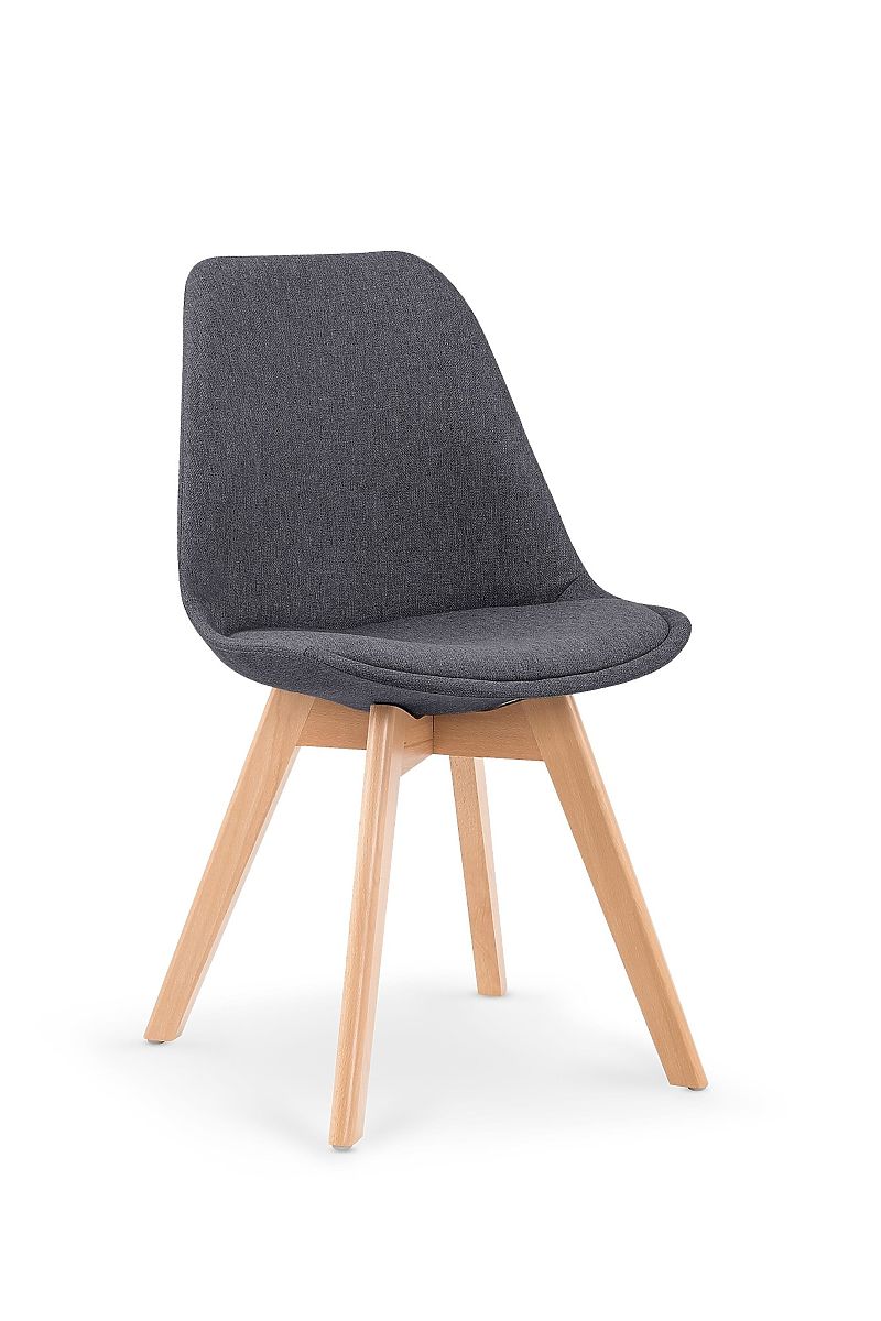 Stolička K303 s tmavo sivým čalúnením a drevenými nohami. .. viac