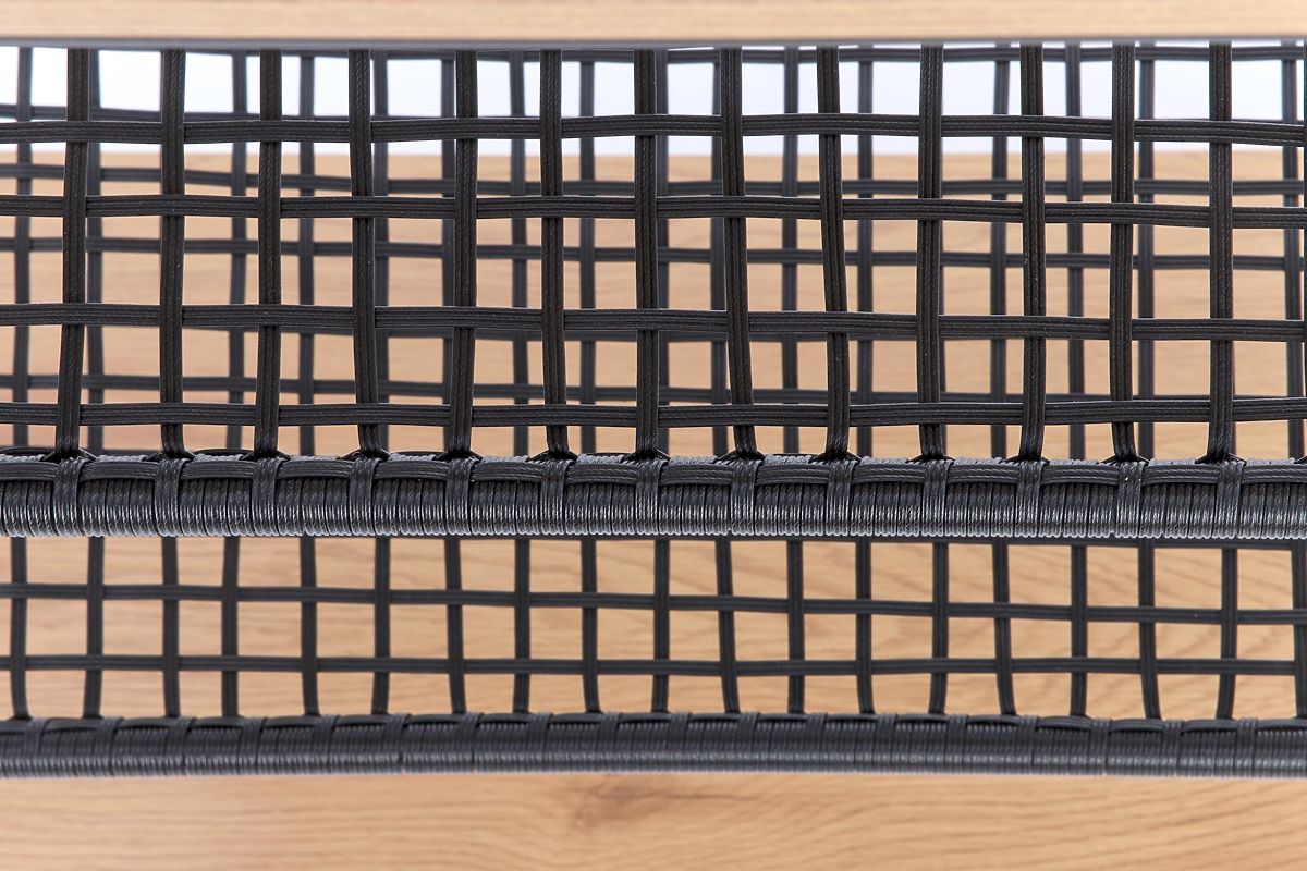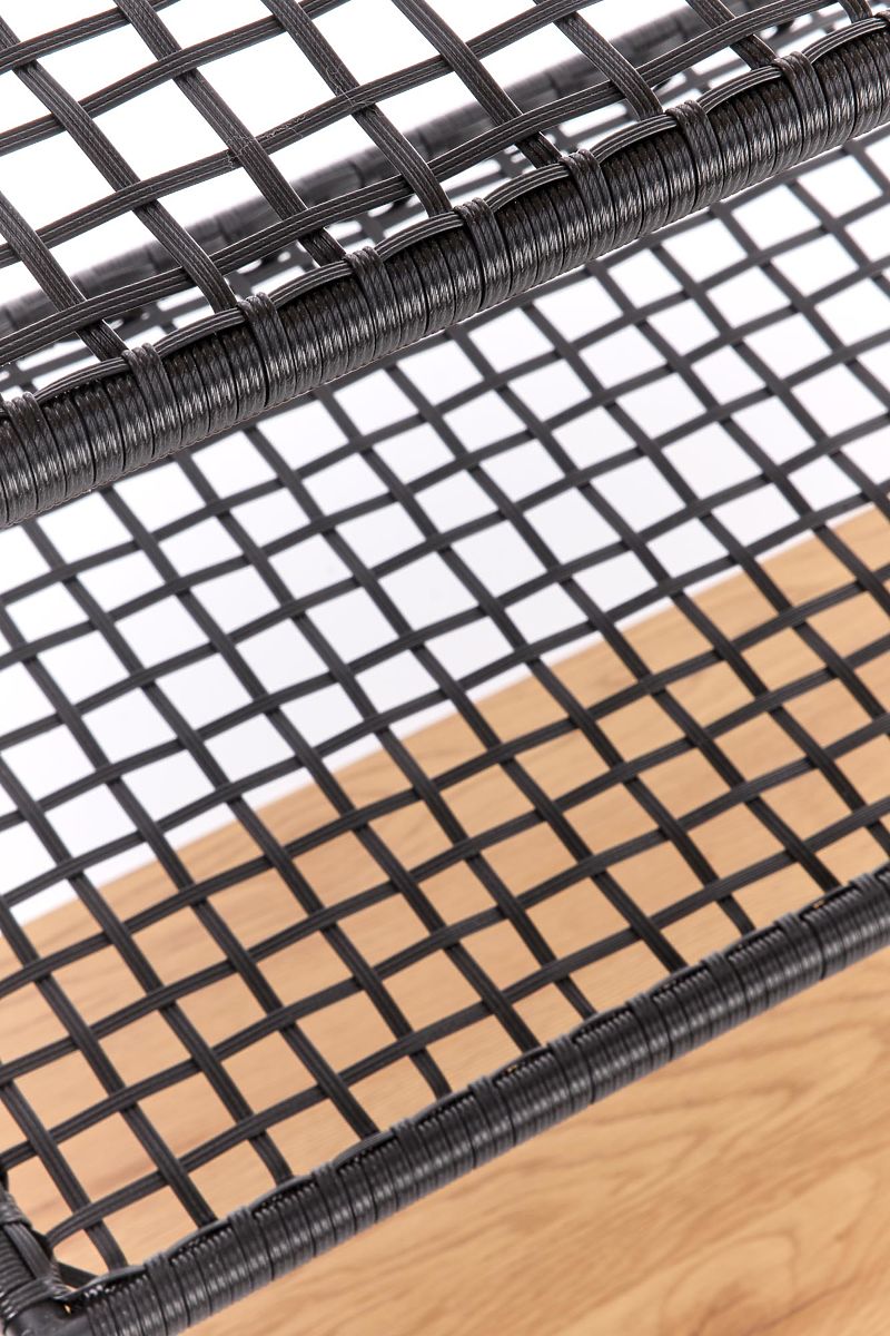 Police sú z laminovanej MDF dosky vo farbe zlatý dub a syntetického ratanu. Konštrukcia je vyrobená z práškovo lakovanej ocele čiernej farby.