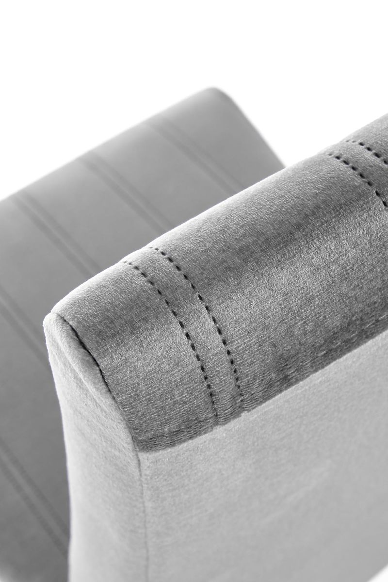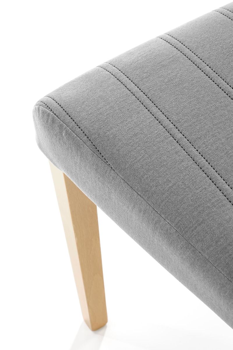 Konštrukcia je vyrobená z masívneho bukového dreva v prírodnej farbe. Polstrovaný sedák a operadlo sú potiahnuté príjemnou zamatovou látkou svetlosivej farby. Decentné prešívané pruhy dodávajú stoličke eleganciu.