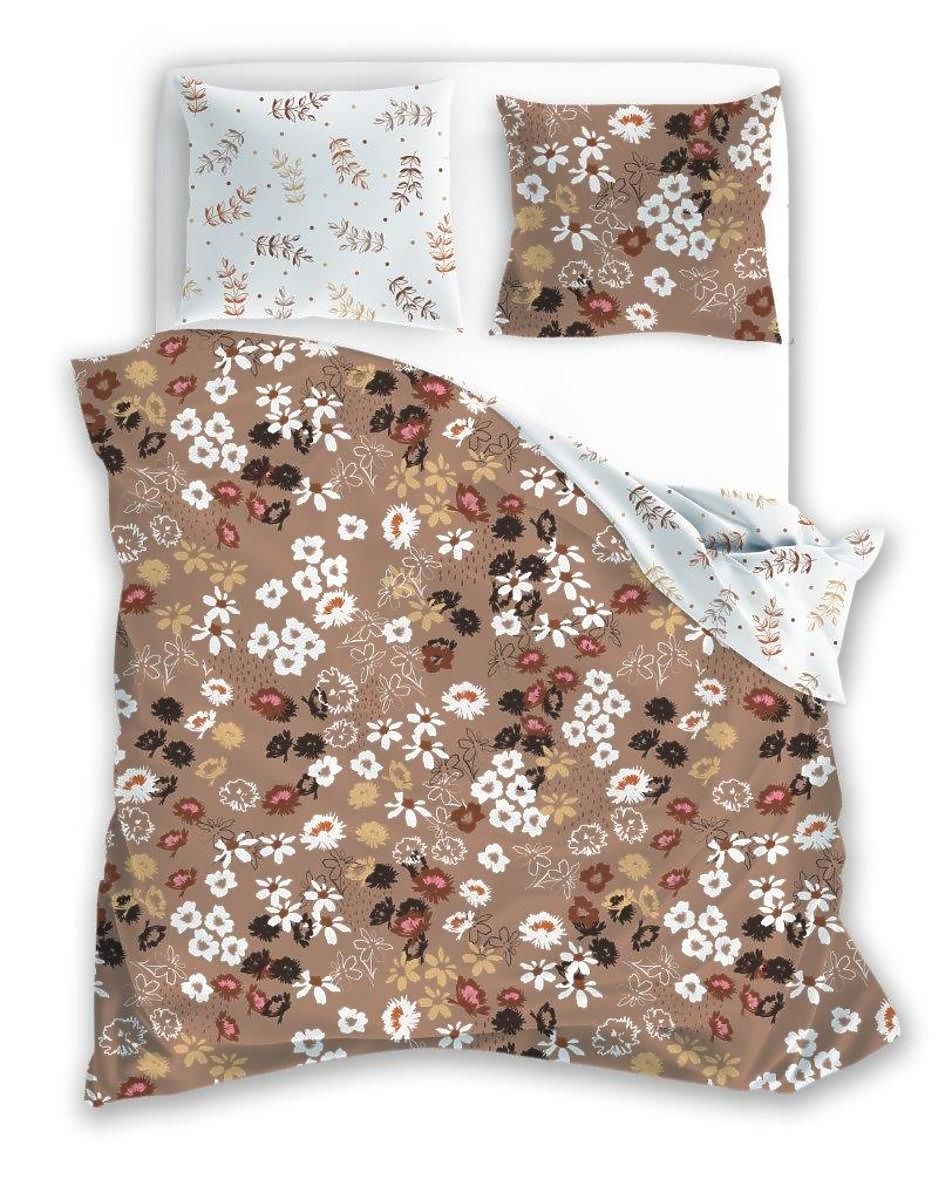 Set obliečok obsahuje obliečku na prikrývku 140 x 200 cm a obliečku na vankúš 70 x 90 cm . Obliečky sú obojstranné , kde prednú stranu zdobia rôznofarebné kvety na hnedom podklade a na druhej strane sú vyobrazené listy a drobné bodky na bielej farbe.