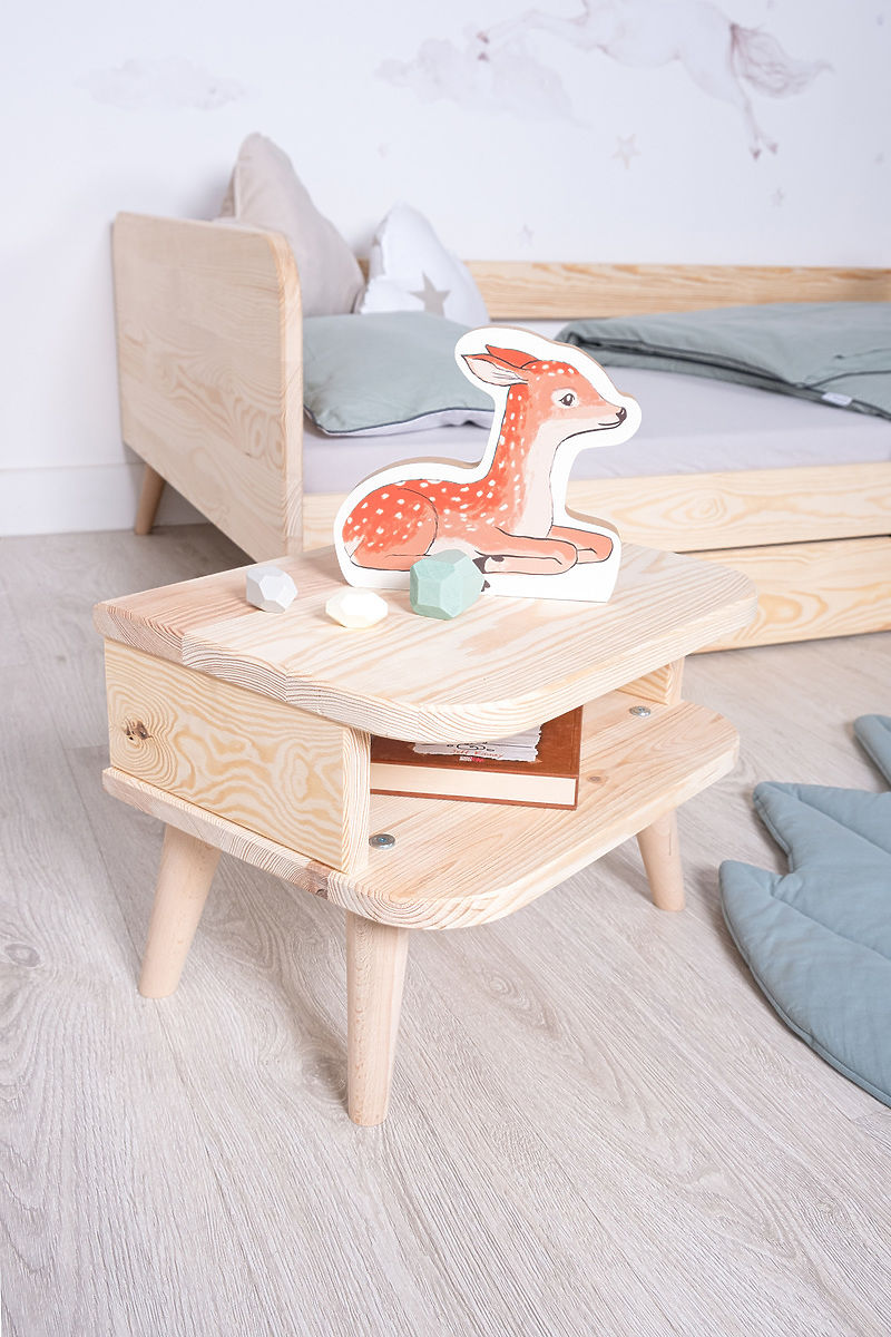 Elegantný nočný stolík z kolekcie NELL značky Ourbaby z prírodného borovicového dreva bude dokonalým doplnkom do detskej izby. Jeho prírodný vzhľad je očarujúce a disponuje pevnými bukovými nôžkami, ktoré prinášajú príjemný dotyk prírody. Tento nočný stolík ponúka viac ako len miesto na odkladanie vecí. S praktickou odkladacou poličkou poskytuje dostatok priestoru na knihy, hodinky, mobilné telefóny a ďalšie osobné veci. Bukové nôžky nielen zaisťujú stabilitu a odolnosť, ale taktiež prinášajú prírodnú eleganciu do interiéru.