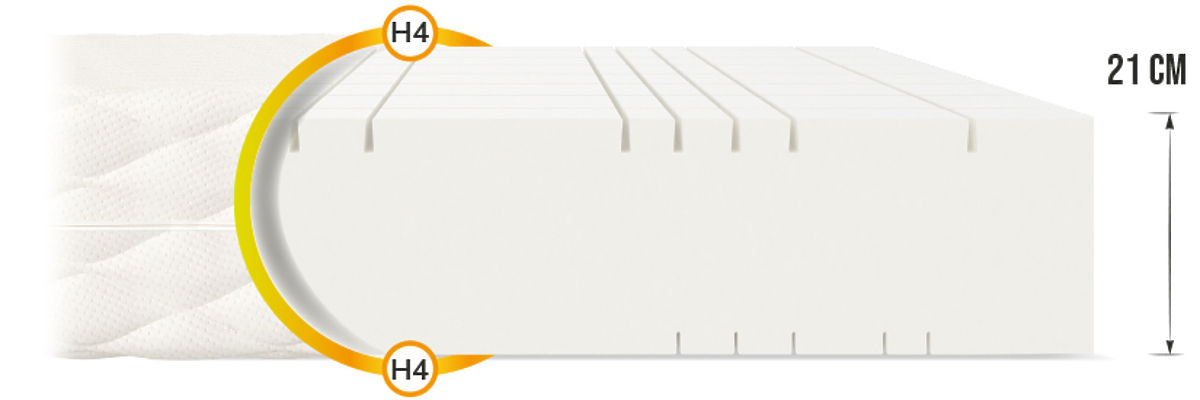 Přejete si, aby váš spánek byl kvalitní, zdravý a pohodlný? Oboustranná matrace Goya Max o výšce 21 cm to vše nabízí! Pěnová matrace je rozdělena do 7 zón díky řadě podélných a příčných řezů. To vede k výraznému zvýšení plasticity, která poskytuje skvělou oporu páteře.