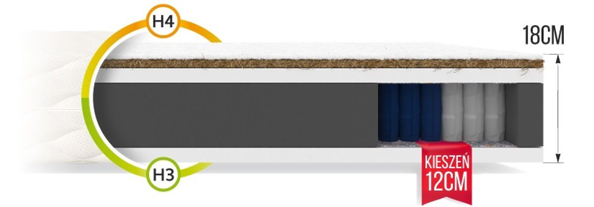 S obojstranným matracom FAMILY o výške 18 cm bude vaša posteľ najpohodlnejším miestom na odpočinok. Konštrukcia matraca zabezpečuje, že telo spiaceho má správnu oporu a svaly nie sú napäté. Vďaka tomu budete vítať rána bez bolestí chrbta, ramien a šije.