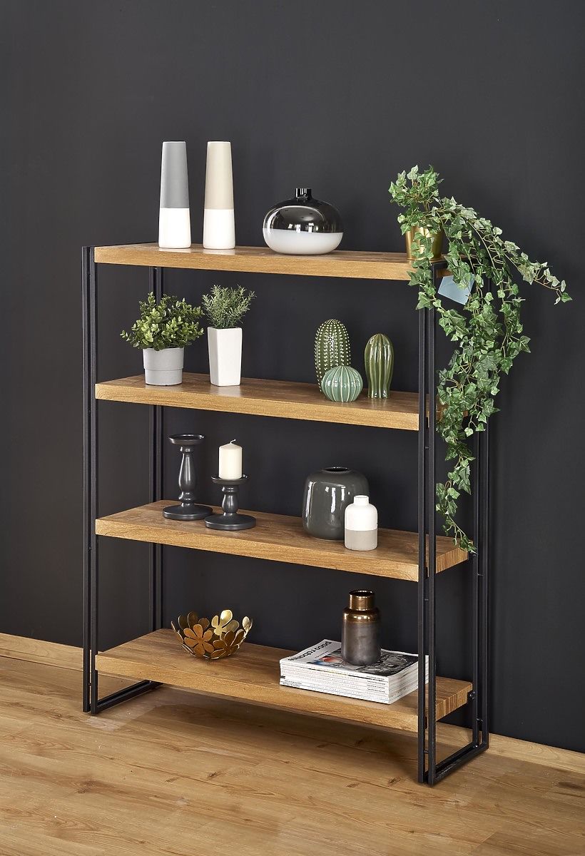 Regál je vyrobený z laminovanej MDF dosky v dekore zlatý dub, čo zaisťuje elegantný vzhľad. Jeho čierna stabilná konštrukcia z práškovo lakovanej ocele dodáva regálu moderný a štýlový dizajn.