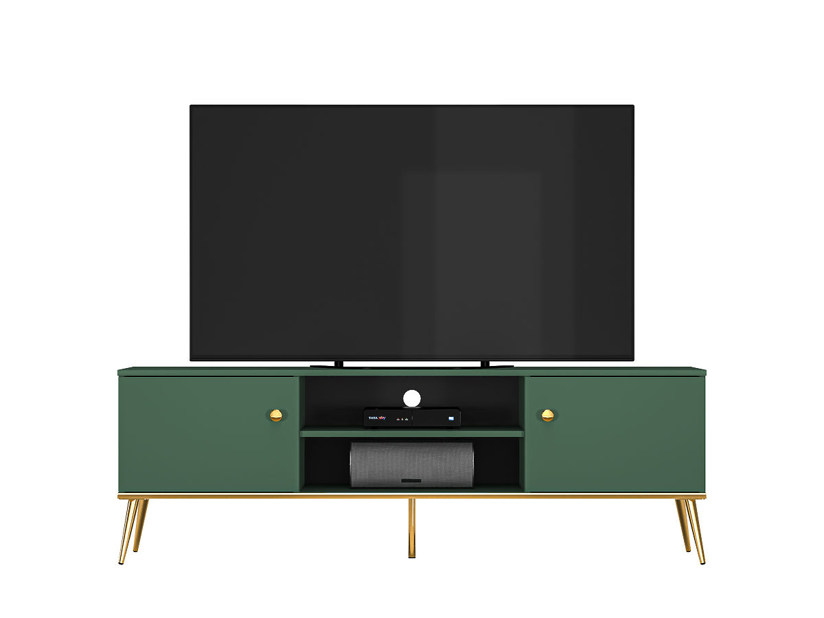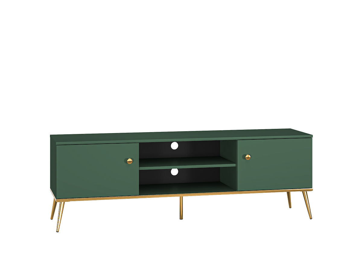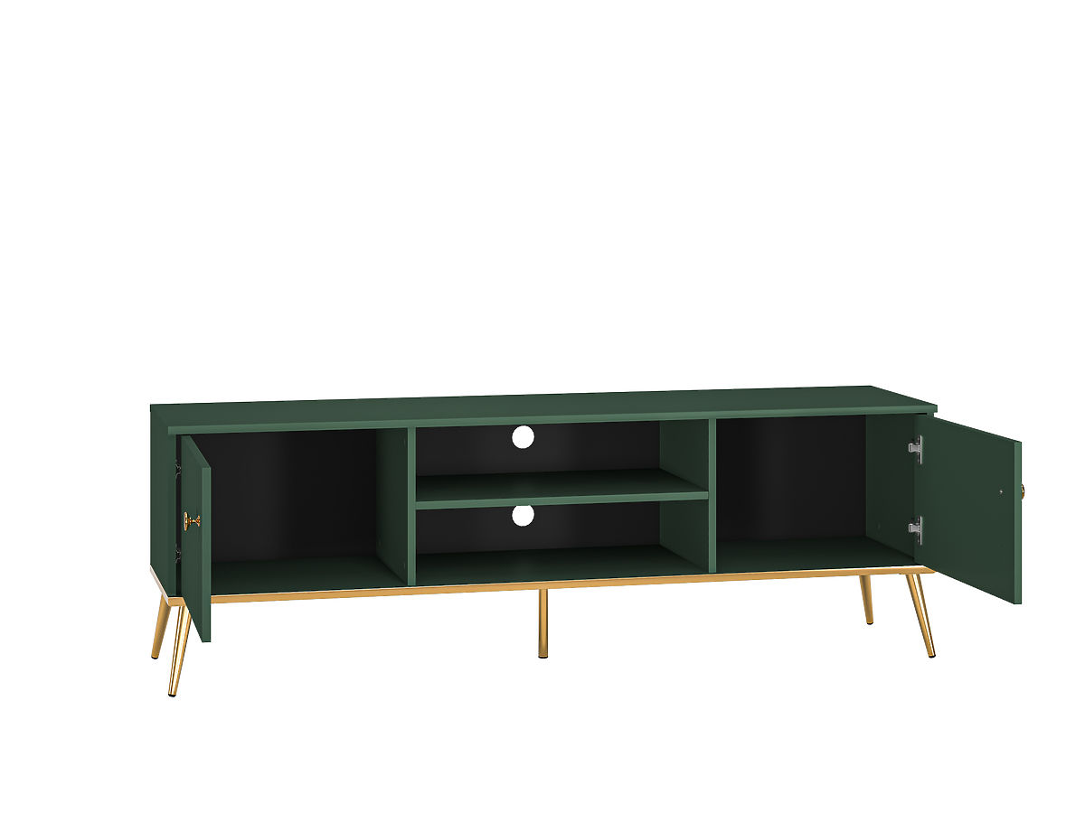Krásny televízny stolík Forest nie je iba esteticky pôsobivým kúskom nábytku, ale aj veľmi praktickým. Vďaka veľkému úložnému priestoru poskytuje dostatok miesta na rôzne elektronické zariadenia, knihy či iné veci. Jedinečný dizajn a farebná kombinácia tmavo zelenej farby so zlatou vnesie do vášho domova eleganciu, pokoj a harmóniu. Skvele sa hodí do moderného interiéru aj bývania v retro štýle.