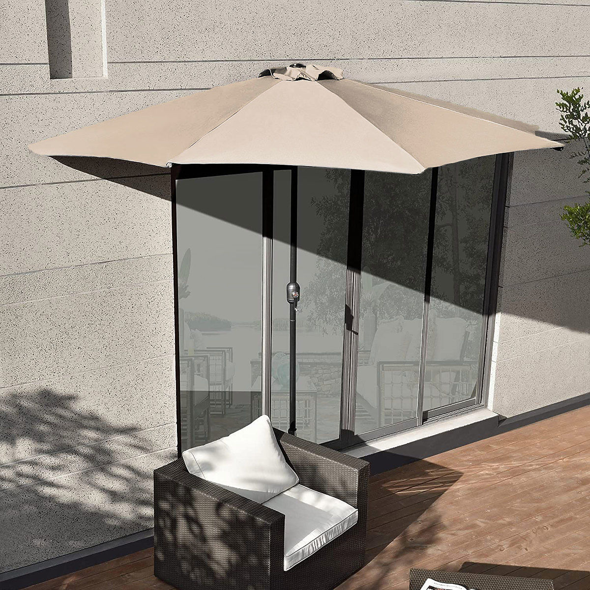 Ak chcete vytvoriť zatienené chránené miesto v malom priestore, náš funkčný slnečník bude vynikajúcim riešením. Vďaka polkruhovej strieške ho môžete umiestniť priamo k stene, čo znamená, že slnečník je ideálny pre úzke balkóny alebo terasy.