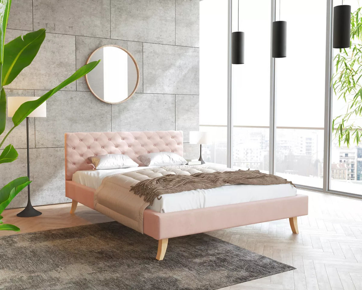 Poťahovým materiálom čalúnenej postele je púdrovo ružová velúrová látka Trinity. Vyznačuje sa jemnou štruktúrou a zároveň vysokou odolnosťou aj proti slnečnému žiareniu. Je mäkká, nadýchaná a príjemná na dotyk. Rovnako je veľmi odolná proti oderu a žmolkovaniu. Zaujme vás svojím moderným vzhľadom a ozdobným prešívaním čela postele.