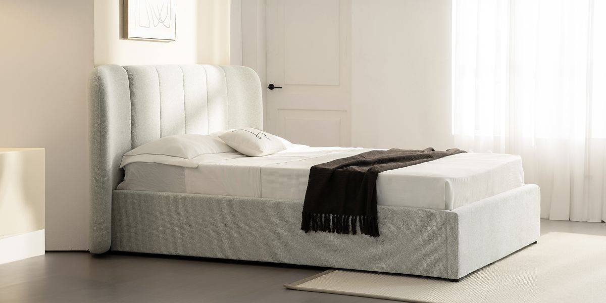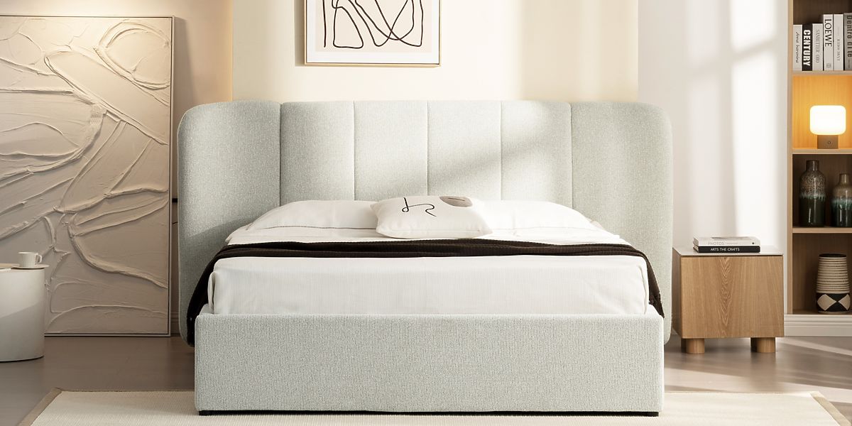 Čalúnená posteľ Snoovia so svetlo béžovým odtieňom a úložným priestorom. .. viac