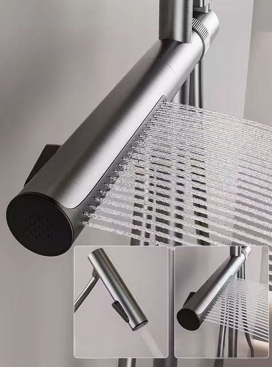 Osobitnú pozornosť si zaslúži rozšírená funkčnosť: v držiaku súpravy je integrovaná výsuvná, dvojfunkčná sprchová hlavica s kaskádovým a bočným prúdom vody, ktorá môže slúžiť ako praktická bidetka. Ďalej súprava obsahuje klasickú sprchovú hlavicu s moderným vzhľadom – vybavenú prepínačom prúdu vody a dažďovou sprchou.