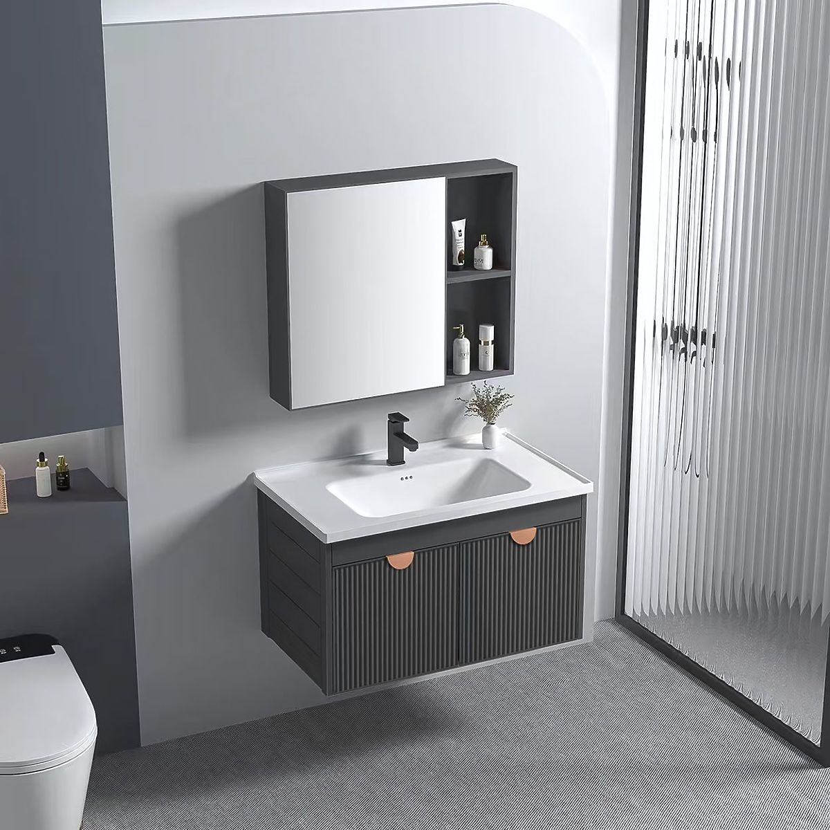 Moderná kúpeľňová súprava Mario – skrinka s umývadlom + skrinka so zrkadlom Súprava kúpeľňového nábytku Mario je návrh, ktorý kombinuje štýlový vzhľad s každodennou funkčnosťou. Skvele sa hodí do moderných kúpeľní, kde záleží na pohodlí a premyslenej organizácii priestoru. Súprava pozostávajúca z závesnej skrinky pod umývadlo a skrinky so zrkadlom je hotové riešenie, ktoré umožňuje vytvoriť praktickú a jednotnú umývadlovú zónu bez nutnosti hľadania samostatných prvkov. h4. Minimalistická forma, ktorá sa hodí všade Model Mario sa vyznačuje charakteristickými, vertikálne drážkovanými čelami, ktoré dodávajú celku moderný a dynamický vzhľad. K dispozícii sú dve farebné varianty – grafitová a biela, obe doplnené o elegantnú úchytku v medenej farbe. Vďaka tomu sa súprava skvele hodí k módnym aranžmánom, ako v tlmenej, tak aj výraznejšej verzii. h4. Praktické riešenia pre každodenné použitie Skrinka so zrkadlom je vybavená otvorenými policami, ktoré zabezpečujú rýchly prístup k dennej kozmetike. Dolná skrinka pojme väčšie predmety, ako sú čistiace prostriedky alebo kozmetika v fľašiach. Celok je montovaný na stenu, čo nielen opticky zväčšuje priestor, ale tiež uľahčuje udržiavanie čistoty okolo nábytku. h4. Umývadlo prispôsobené celku Súčasťou je keramické umývadlo s otvorom pre batériu, prispôsobené veľkosťou dolnej skrinke. Jeho univerzálna forma dobre ladí so zvyškom súpravy, tvoriace jednotný a estetický celok. Mario je súprava, ktorá ponúka jednotný vzhľad a praktické riešenia – pripravená na montáž a okamžité použitie v každej modernej kúpeľni.