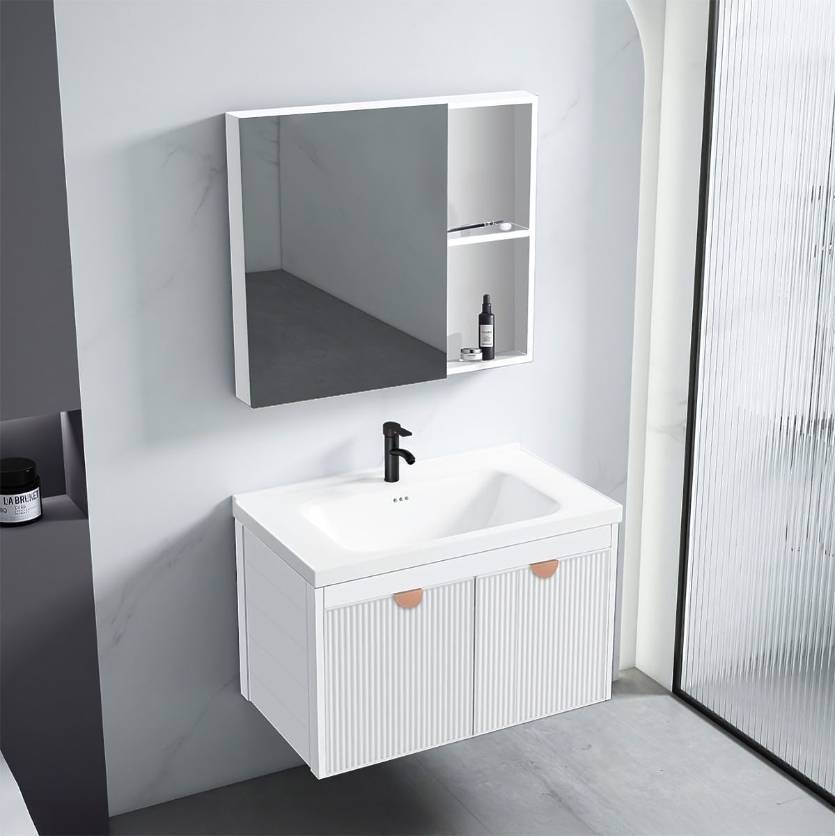 Moderná kúpeľňová súprava Mario – skrinka s umývadlom + skrinka so zrkadlom Súprava kúpeľňového nábytku Mario je návrh, ktorý kombinuje štýlový vzhľad s každodennou funkčnosťou. Skvele sa hodí do moderných kúpeľní, kde záleží na pohodlí a premyslenej organizácii priestoru. Súprava pozostávajúca z závesnej skrinky pod umývadlo a skrinky so zrkadlom je hotovým riešením, ktoré umožňuje vytvoriť praktickú a jednotnú umývadlovú zónu bez nutnosti hľadania samostatných prvkov. Minimalistická forma, ktorá sa hodí všade Model Mario sa vyznačuje charakteristickými, vertikálne ryhovanými čelami, ktoré dodávajú celku moderný a dynamický vzhľad. Na výber sú dve farebné varianty – grafitová a biela, obe doplnené elegantnou úchytkou v medenej farbe. Vďaka tomu sa súprava skvele hodí k módnym aranžmánom, ako v tlmenej, tak výraznejšej verzii. Praktické riešenia pre každodenné použitie Skrinka so zrkadlom je vybavená otvorenými policami, ktoré zabezpečujú rýchly prístup k denným kozmetickým prípravkom. Dolná skrinka pojme väčšie predmety, ako sú čistiace prostriedky alebo kozmetika vo fľašiach. Celá súprava je montovaná na stenu, čo nielen opticky zväčšuje priestor, ale tiež uľahčuje udržiavanie čistoty okolo nábytku. Umývadlo prispôsobené celku Súčasťou je keramické umývadlo s otvorom na batériu, prispôsobené veľkosťou dolnej skrinke. Jeho univerzálna forma dobre ladí so zvyškom súpravy, tvoriac jednotný a estetický celok. Mario je súprava, ktorá ponúka jednotný vzhľad a praktické riešenia – pripravená na montáž a okamžité použitie v každej súčasnej kúpeľni.
