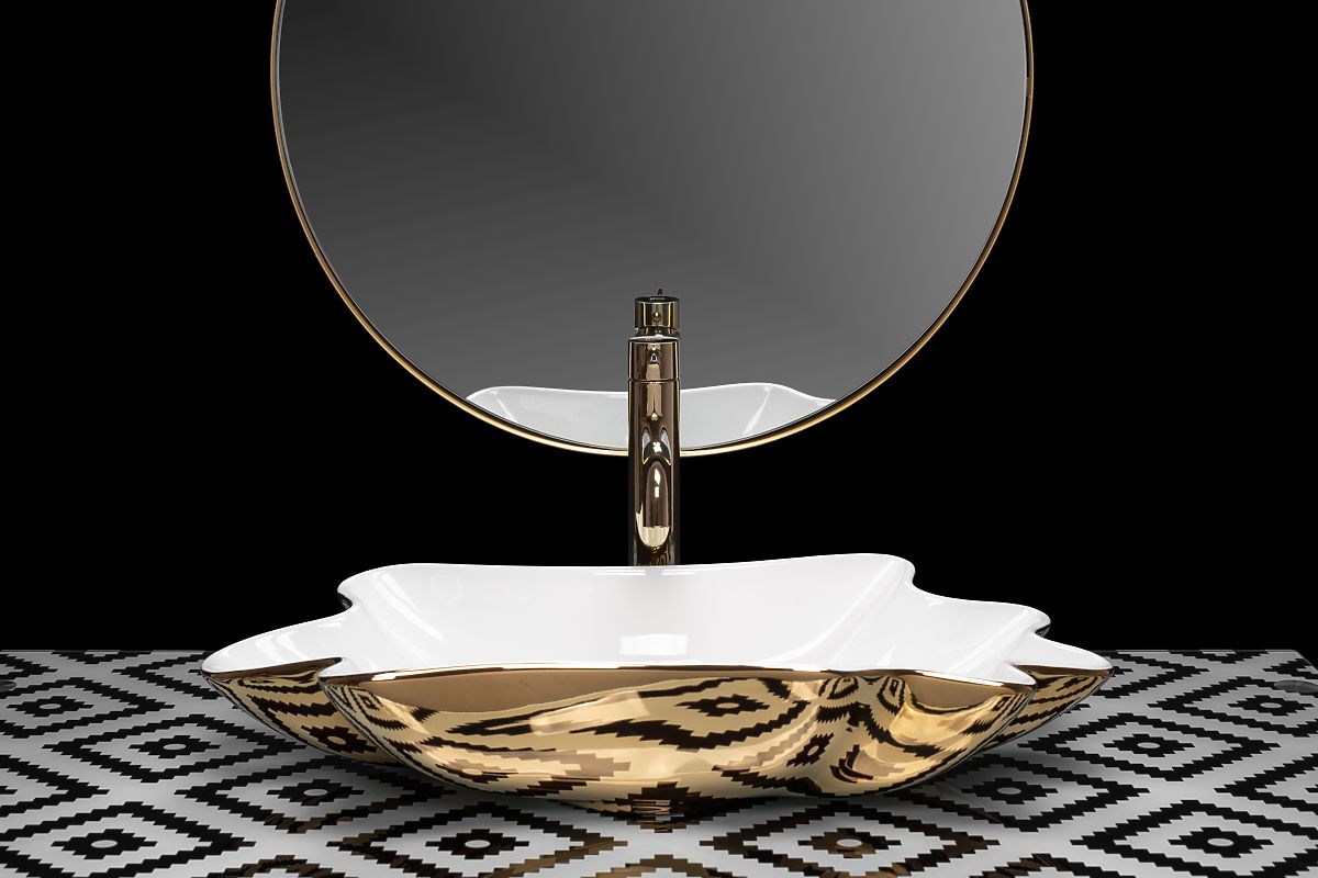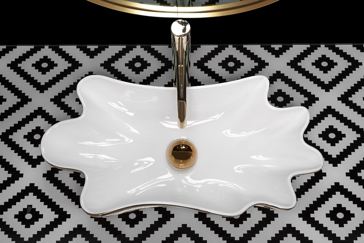 Umyvadlo vyrobené z najkvalitnejšej keramiky v bielej farbe a oválnom, zvlnenom tvare. Umyvadlo je zakončené zlatým okrajom, čo dodáva krásny konečný efekt. Umyvadlo je neuveriteľne atraktívne na pohľad, je ideálne pre milovníkov neštandardných tvarov, prináša eleganciu do usporiadania kúpeľne doma aj v kancelárii.