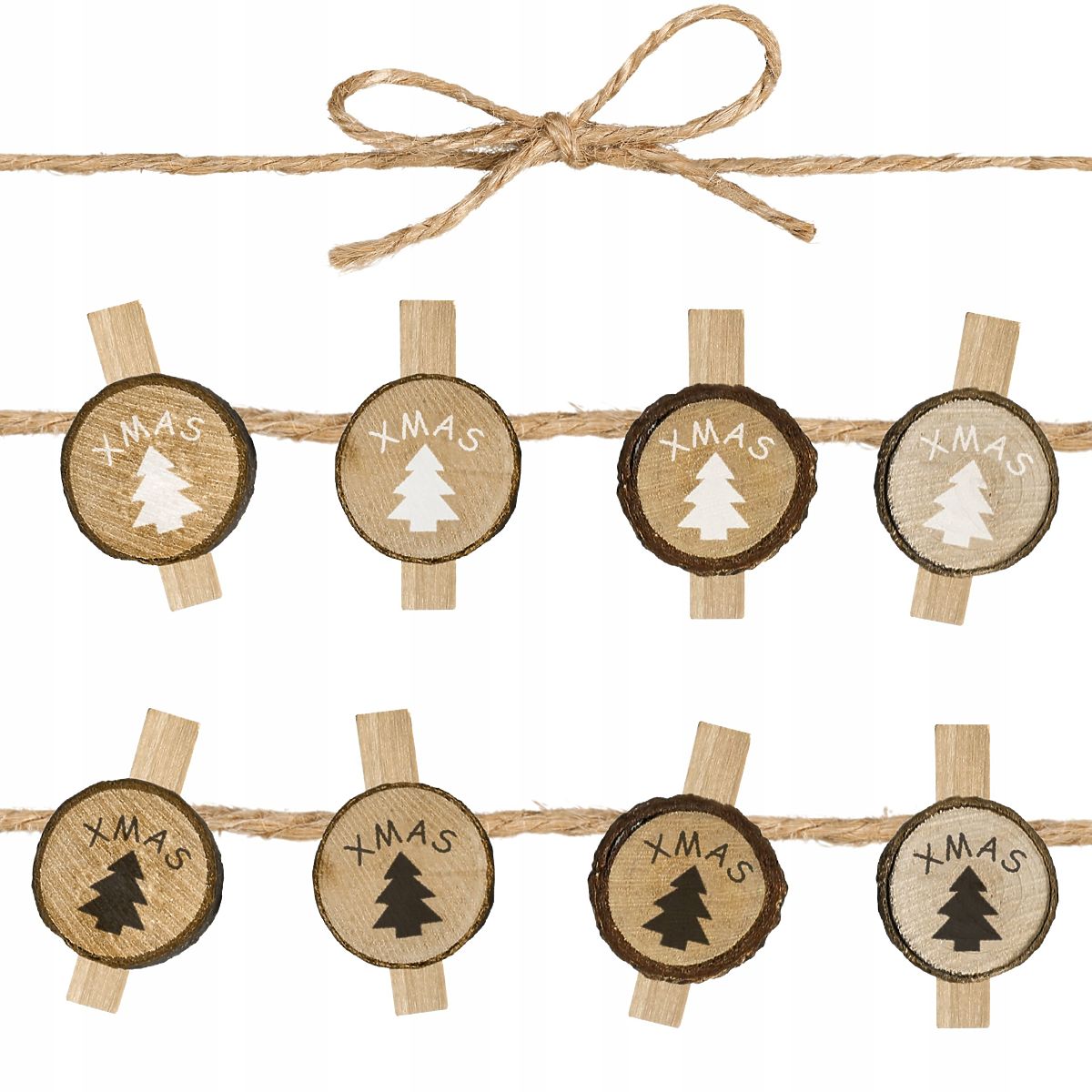 Sada ôsmich drevených štipcov s motívom stromčeka a nápisom XMAS je drobný detail, ktorý dokáže úplne zmeniť charakter vianočných dekorácií. Prírodné drevo v kombinácii s rustikálnym prevedením vytvára ozdobu plnú tepla a útulnosti, ktorá dokonale zapadá do atmosféry Vianoc. Štipce majú dĺžku 5 cm a boli vyrobené s dôrazom na každý detail, vďaka čomu ich možno opakovane používať v ďalších sezónach.