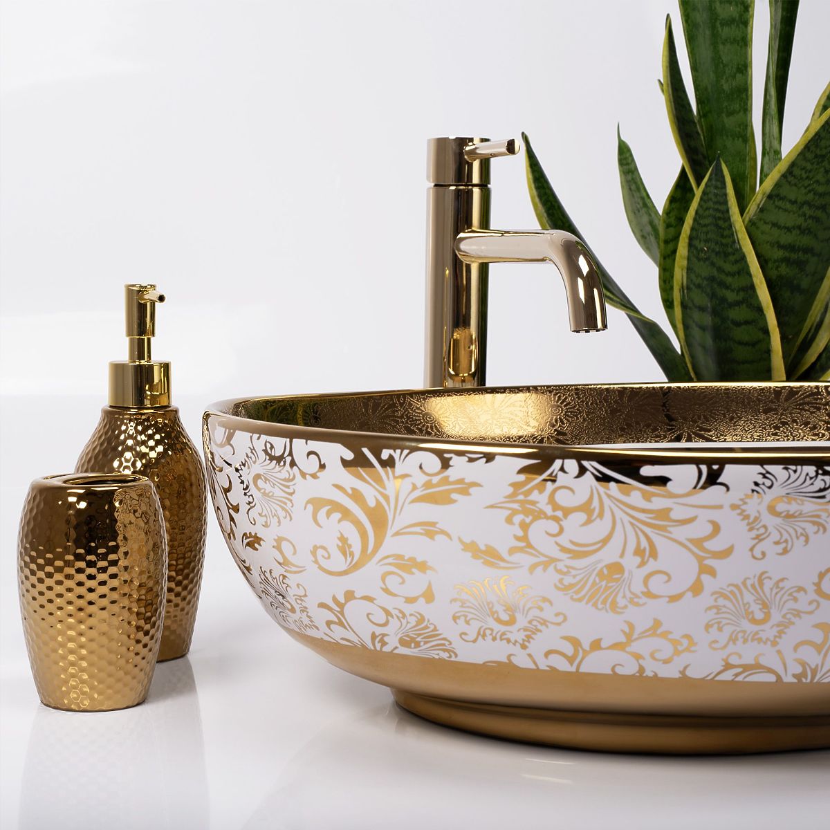 Jedná sa o produkt, ktorý skvele doplní váš kúpeľňový priestor a zachová bezchybný vzhľad a estetiku interiéru. Misa je pokrytá krásnou zlatou farbou s rastlinným motívom, ktorý kontrastuje s bielou farbou.