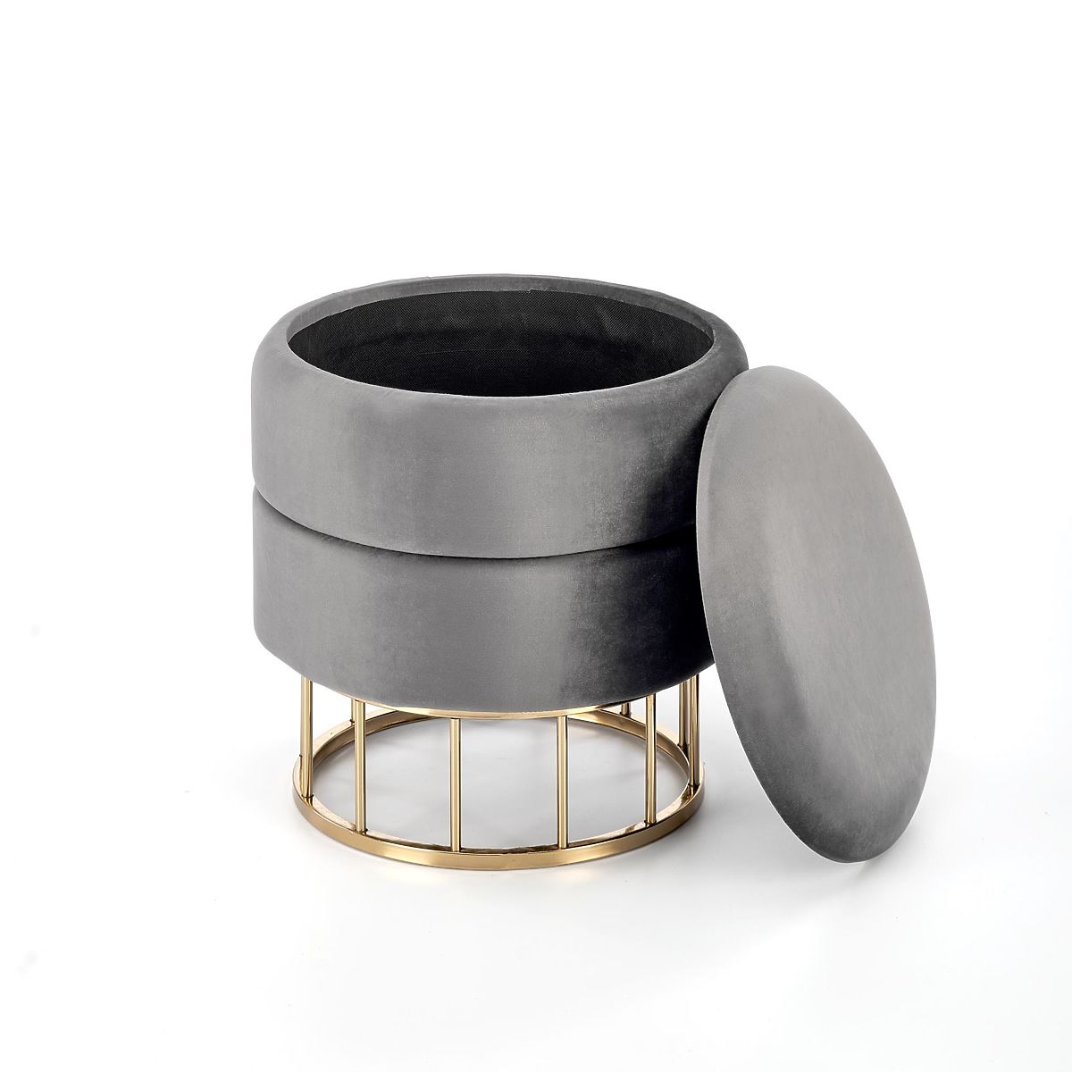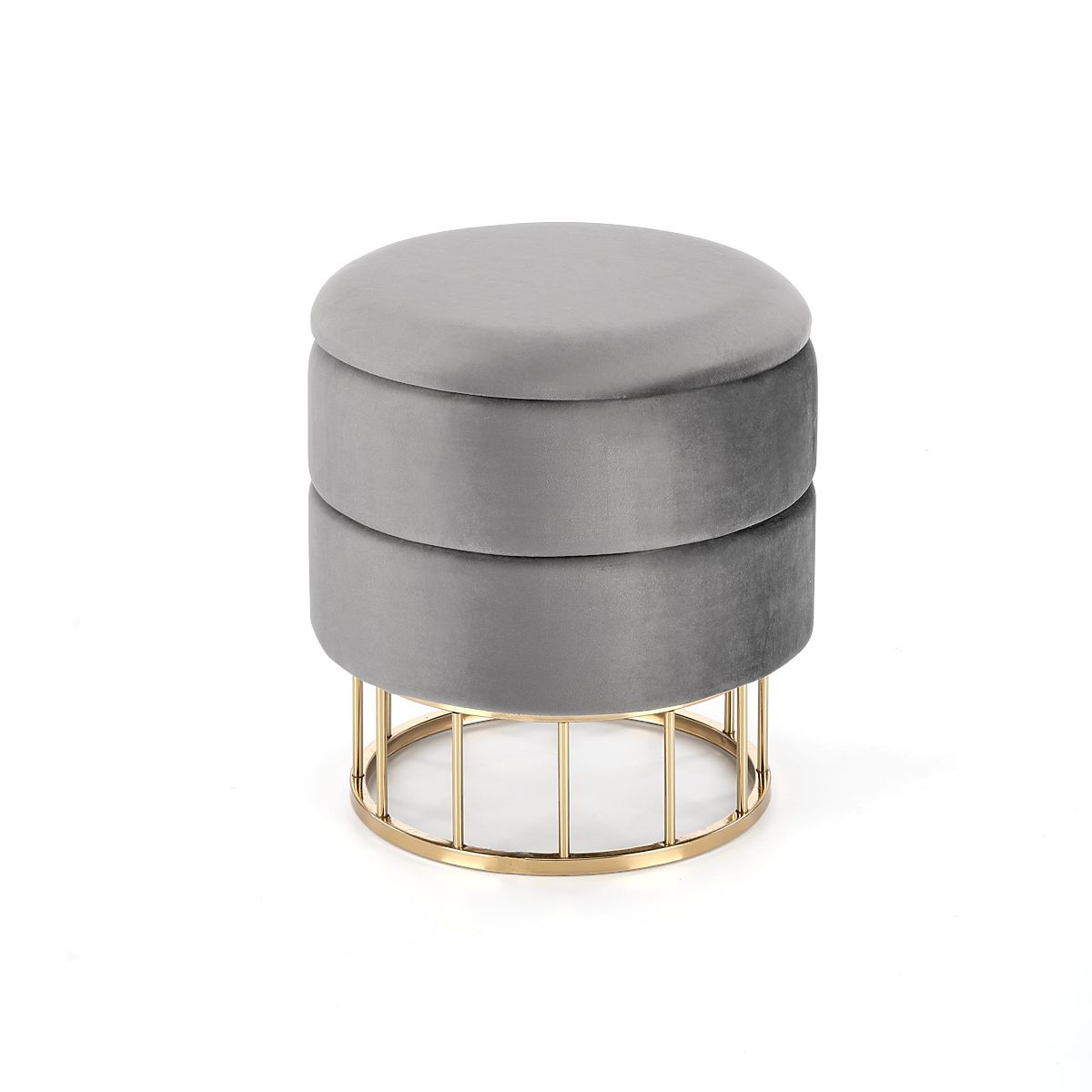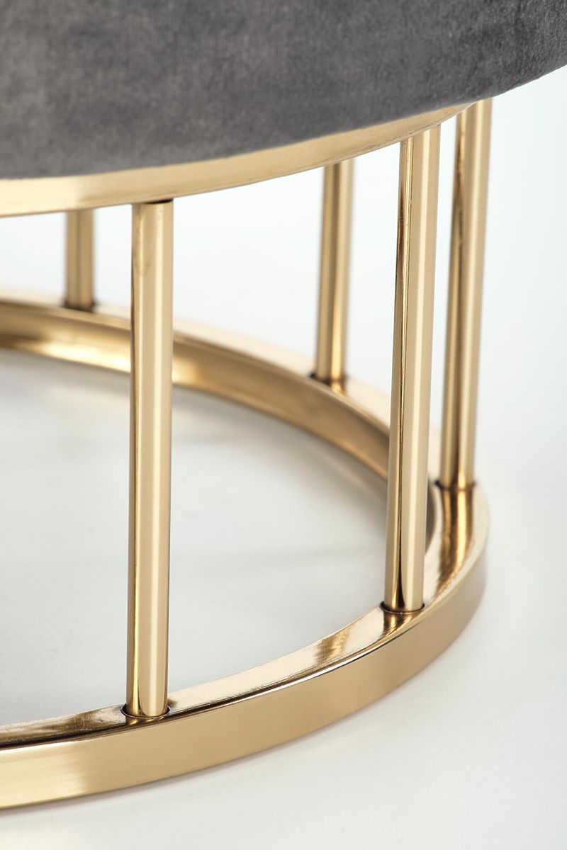 Pufa z tkaniny a chrómovanej ocele v sivej a zlatej farbe. .. viac