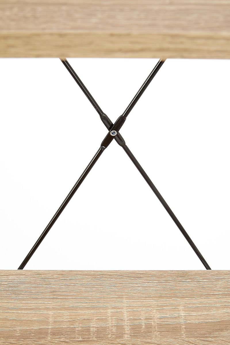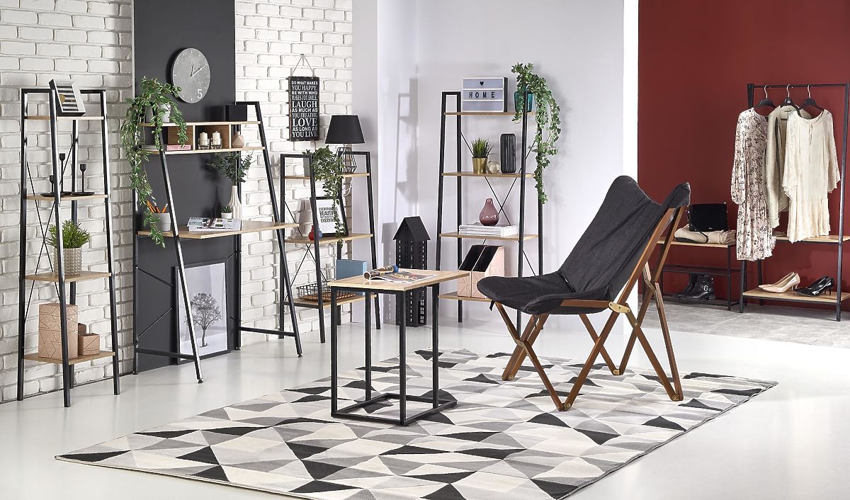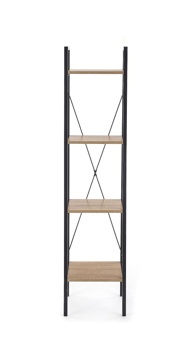 Regál je tvorený štyrmi otvorenými policami, ktoré poskytujú prehľadný úložný priestor pre knihy, dekorácie alebo doplnky. Police z laminovanej drevotriesky v dekore dub sonoma sú doplnené pevnou konštrukciou z práškovanej ocele v čiernej farbe, ktorá zaisťuje stabilitu a podčiarkuje industriálny vzhľad.