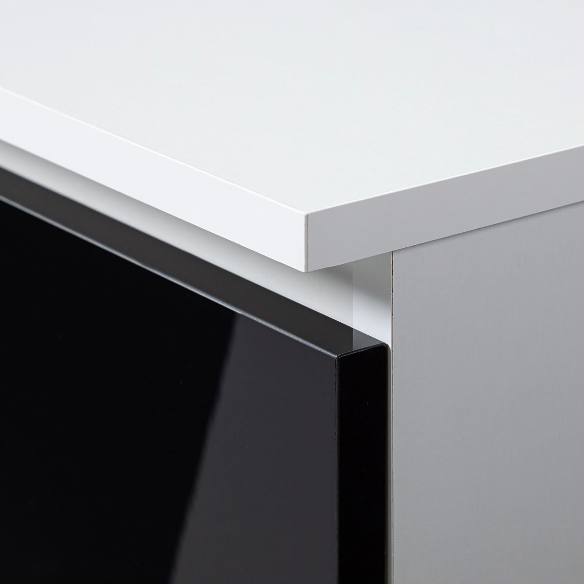 Korpus stola je vyrobený z laminovanej dosky biely polomat o hrúbke 16mm, zatiaľ čo čelá zásuviek sú z MDF dosky akryl vysoký lesk o hrúbke 19mm. Nábytok je odolný proti oderu a vďaka viditeľným hranám olepeným ABS hranou je zvýšená jeho odolnosť proti rôznym druhom mechanického poškodenia. Zásuvky stola aj jeho výsuvná polička na klávesnicu sa pohybujú na trvanlivých, tichých a spoľahlivých kovových guličkových pojazdoch.
