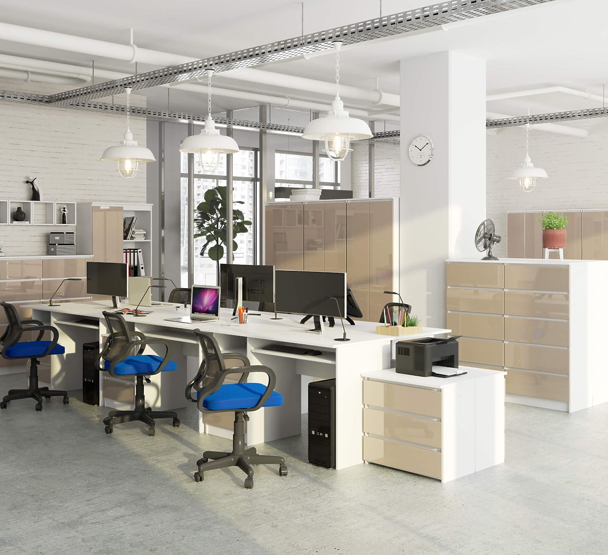 Písací stôl s bielym korpusom a cappuccino zásuvkami s vysokým leskom. .. viac