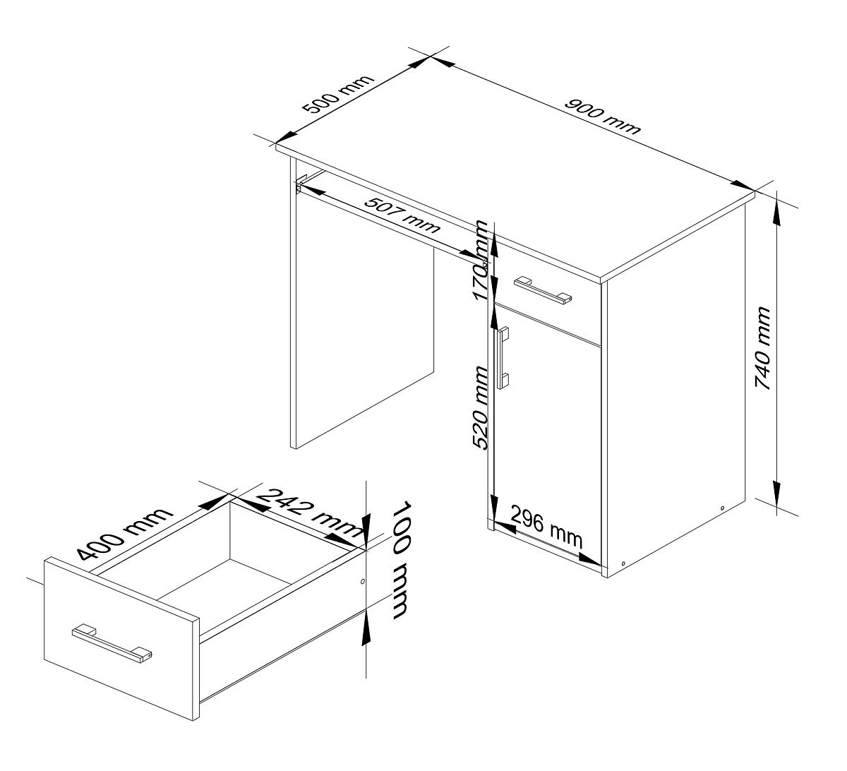 Kombinácia klasiky a modernosti v najlepšom prevedení - tak možno opísať počítačový stôl PIN s dĺžkou 90 centimetrov. Je to ideálna voľba pre menšie priestory, kde je potrebné vytvoriť kútik pre prácu na počítači. Nábytok je vyrobený z laminovanej dosky (hrúbka 16 milimetrov), odolnej proti oderu a trvanlivej. Viditeľné hrany stola sú olepené ABS hranou, ktorá sa vyznačuje zvýšenou odolnosťou proti poškodeniu. Navyše je zadná časť stola vybavená laminovanou doskou, čo umožňuje jeho ľubovoľné umiestnenie v izbe alebo kancelárii. Rozmery stola sú 90 cm x 74 cm x 50 cm. Pozornosť si zaslúži aj cena produktu, ktorý sa vyznačuje funkčnosťou a univerzálnym vzhľadom. Stôl sa skladá z dosky, zásuvky, skrinky a výsuvnej poličky určenej na klávesnicu. Prezentovaná ponuka nájde uznanie ako u ľudí, ktorí si cenia klasicky navrhnuté interiéry, tak u priaznivcov moderných aranžmánov.