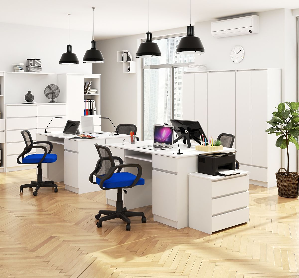 Písací stôl A5 je vyrobený z vysoko kvalitnej, pevnej laminovanej dosky s hrúbkou 16 mm. Ako korpus, tak čelá tohto nábytku sú dostupné v módnej a univerzálnej bielej farbe. Nábytok je vybavený praktickou poličkou na klávesnicu, dvoma zásuvkami a dvoma skrinkami, čo poskytuje značný úložný priestor. Doska stola má dĺžku 135 cm a hĺbku 50 cm, takže je dostatočne veľká pre pohodlné umiestnenie monitora, notebooku alebo písacích potrieb. Tento stôl je priestranný a zároveň kompaktný, pretože má výšku 77 cm a každá zásuvka a skrinka je dlhá 40 cm. Vďaka svojim rozmerom a estetickému, modernému vzhľadu sa tento model skvele hodí ako do študentskej izby, tak do kancelárie.