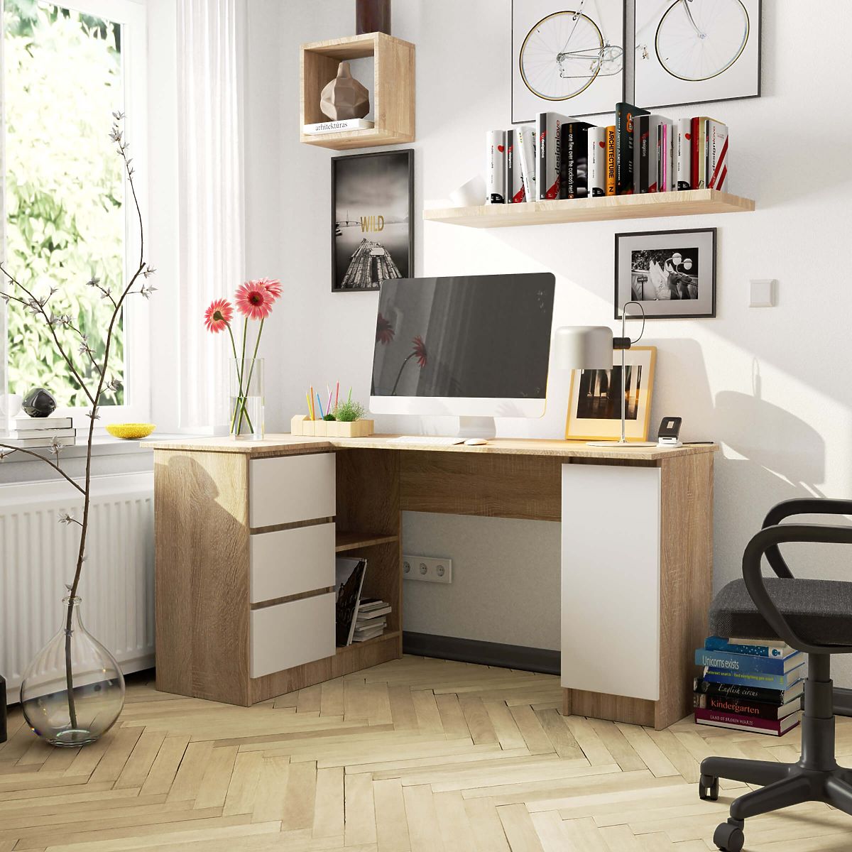 Krásny a funkčný rohový počítačový stôl so skrinkou a zásuvkami je moderný nábytok v obľúbenej farebnej kombinácii našich zákazníkov. Spojenie univerzálnej bielej a veľmi praktického dubu sonoma je skvelou voľbou pre tých, ktorí sledujú aktuálne trendy a chcú vytvoriť efektívny a funkčný pracovný priestor. Rohový stôl dokonale využíva priestor a zároveň poskytuje plne komfortné miesto pre prácu. Je vybavený dlhou doskou a početnými skrinkami a zásuvkami, v ktorých možno uložiť potrebné drobnosti na pracovisku. Nábytok je vyrobený z laminovanej dosky o hrúbke 16 milimetrov, ktorá vykazuje vysokú odolnosť proti oderu. Viditeľné hrany sú olepené ABS hranou so zvýšenou odolnosťou proti poškodeniu. Rozmery stola sú 155 cm x 77 cm x 85 cm. Rohový stôl dub sonoma je kombináciou pevnej konštrukcie, moderného dizajnu a funkčnosti v každom detaile, ktorá je na dosah ruky za atraktívnu cenu.