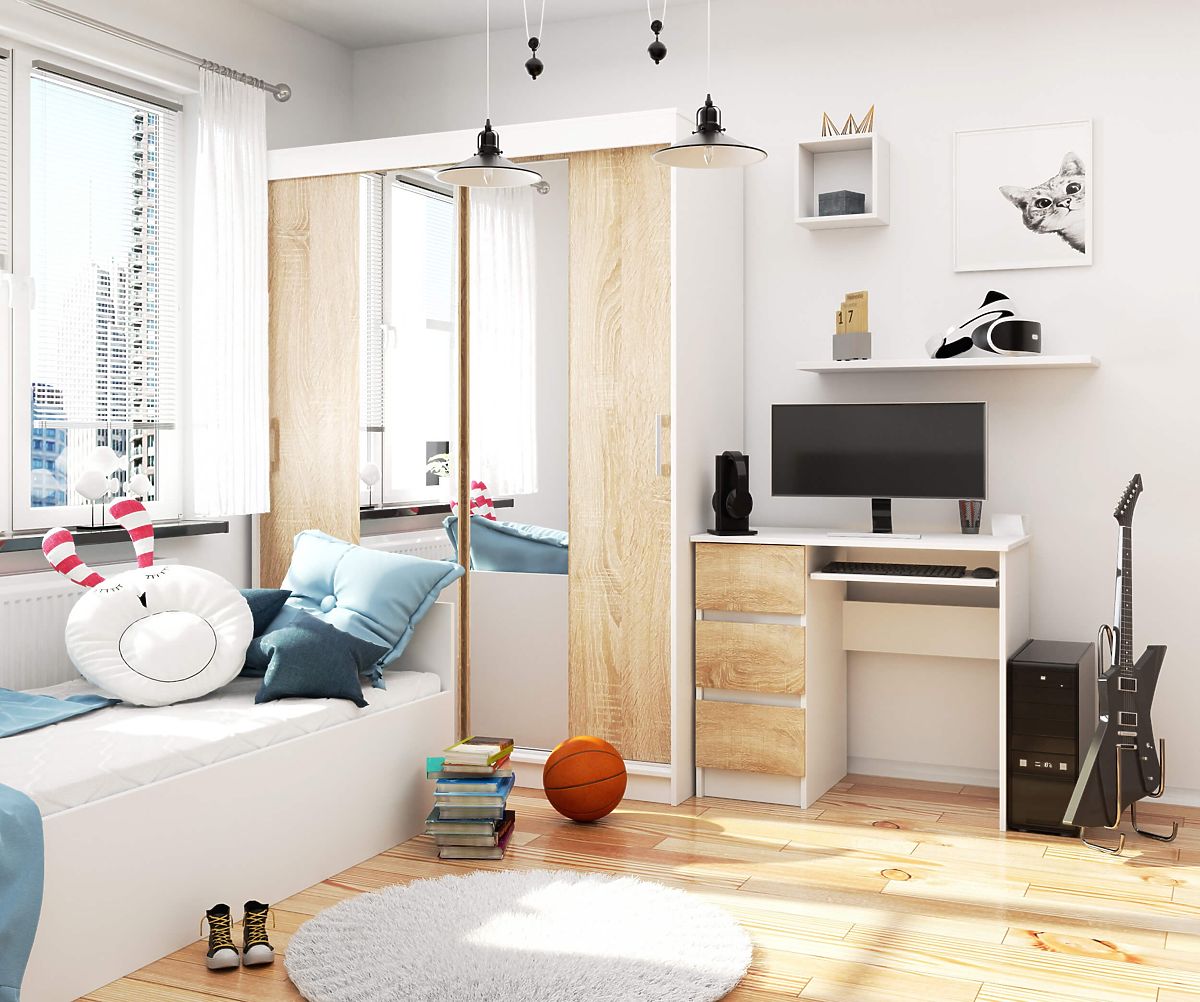 Farba stola je biela, okrem čiel zásuviek, ktoré sú v farbe duba sonoma. Vďaka tomu vyniká svojou originalitou, najmä na pozadí jednofarebného nábytku. Ideálne sa hodí do interiérov s minimalistickým dizajnom. Stôl sa vyznačuje vysokou trvanlivosťou. Ponúkame 24-mesačnú záručnú dobu. Používatelia počítača určite ocenia funkčnosť a vysokú kvalitu prezentovaného stola.