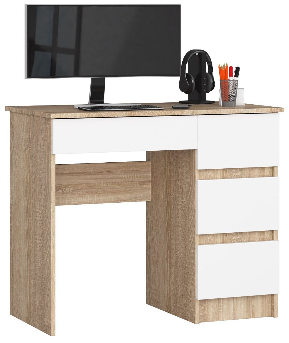 Cenovo dostupný a zároveň kvalitný počítačový stôl, pri ktorom sa môžete pohodlne učiť a pracovať? Áno, to je možné s ponukou nášho obchodu, kde nájdete počítačový stôl A-7 o šírke 90 cm v pravom sonoma a bielej farbe. Je to moderný a zároveň funkčný nábytok. Ideálne sa hodí do obývacej izby, dennej izby, mládežníckej izby alebo kancelárie.