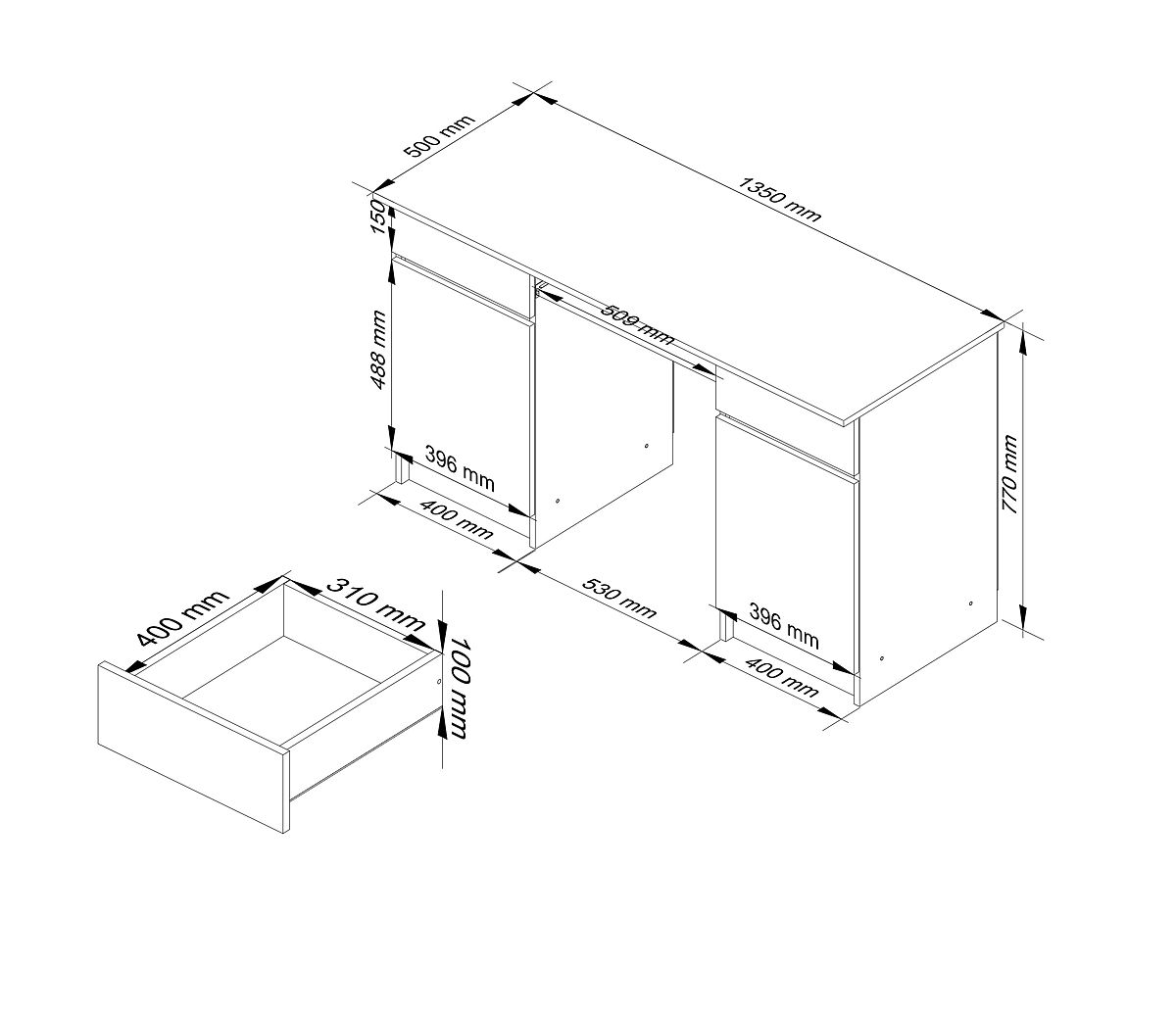- Zásuvky a polica na klávesnicu sa pohybujú na kovových valčekových pojazdoch