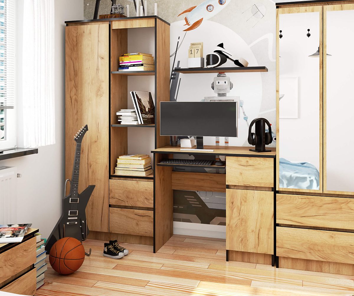 Počítačový stôl PIKSEL 90 cm vo farbe dub craft sa ideálne hodí do malých interiérov. Skvele sa osvedčuje aj ako školský stôl alebo stôl v hotelovej izbe. Aj keď je malých rozmerov, má praktickú bočnú zásuvku a skrinku s policou, kde sa voľne zmestia zošity, zakladače a knihy. Na stôl je možné ľahko umiestniť monitor počítača a klávesnicu umiestniť na výsuvnú policu. Počítačový stôl PIKSEL je vyrobený z príjemnej na dotyk a ľahko udržiavateľnej laminovanej dosky, ktorá je odolná proti oderu. Hladký povrch čiel dodáva celku elegantný charakter.