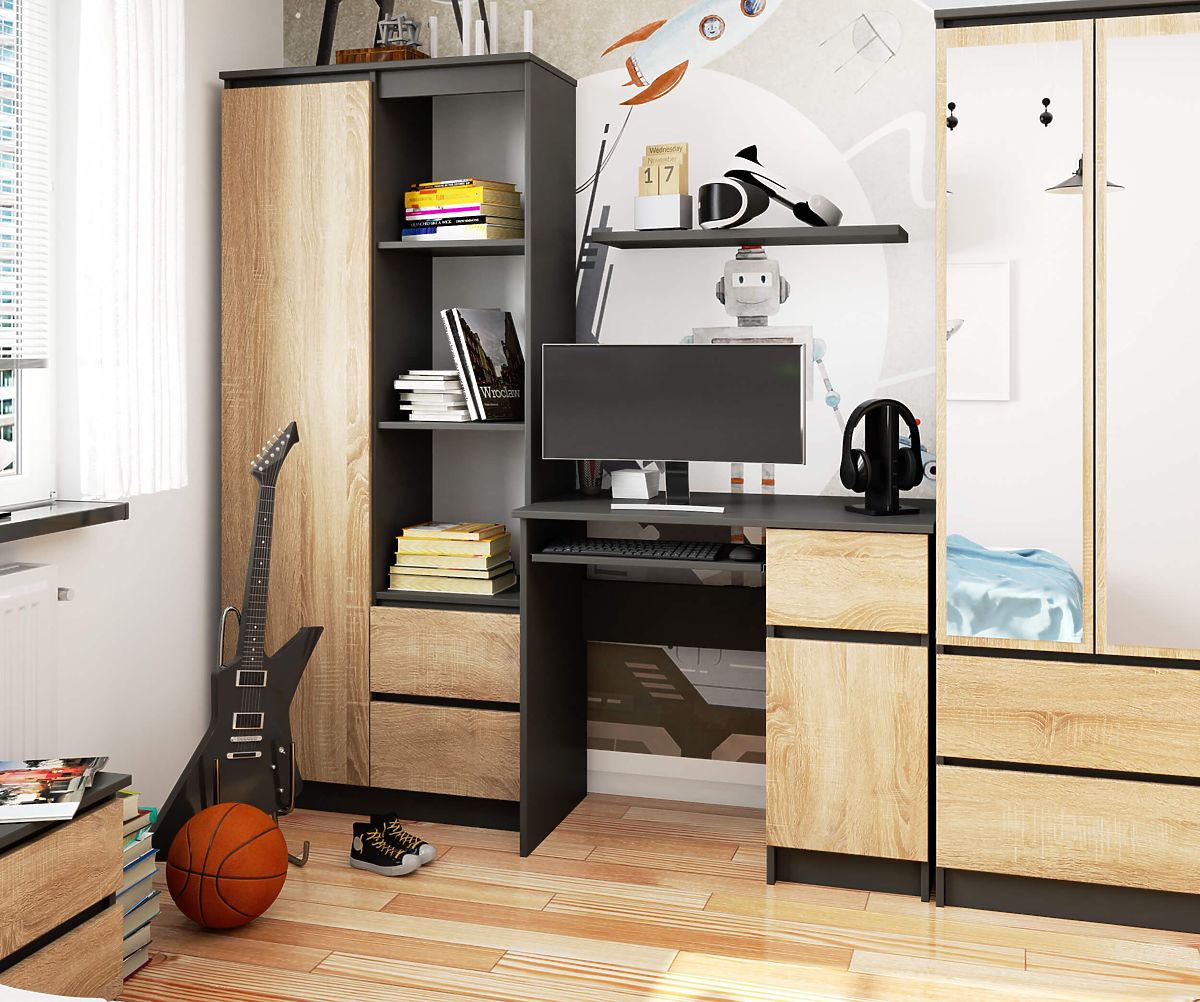 Voľne stojaci stôl PIKSEL 90 cm v farbách GRAFIT ŠEDÁ/DUB SONOMA je ideálnym riešením pre malé interiéry. Veľmi dobre poslúži ako školský alebo počítačový stôl. Jeho ergonomická konštrukcia zaisťuje pohodlie pri používaní. Stôl je vybavený výsuvnou policou na klávesnicu, praktickou bočnou zásuvkou a skrinkou s policou, v ktorej môžu voľne stáť zakladače a knihy. Na výrobu stola bola použitá príjemná na dotyk a ľahko udržiavateľná matná doska pokrytá odolnou vrstvou laminátu. Celok dopĺňajú praktické úchyty v striebornej farbe.
