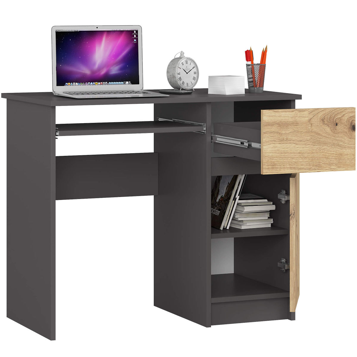 Voľne stojaci stôl PIKSEL 90 cm v farbách GRAFIT ŠEDÝ/DUB ARTISAN je ideálnym riešením pre malé interiéry. Veľmi dobre sa hodí ako školský alebo počítačový stôl. Jeho ergonomická konštrukcia zaisťuje pohodlie pri používaní. Stôl je vybavený výsuvnou policou na klávesnicu, praktickou bočnou zásuvkou a skrinkou s policou, do ktorej sa zmestia šanóny a knihy. Na výrobu stola bola použitá príjemná na dotyk a ľahko udržiavateľná matná doska pokrytá vrstvou laminátu odolnou proti oderu. Celok dopĺňajú praktické úchyty v striebornej farbe.