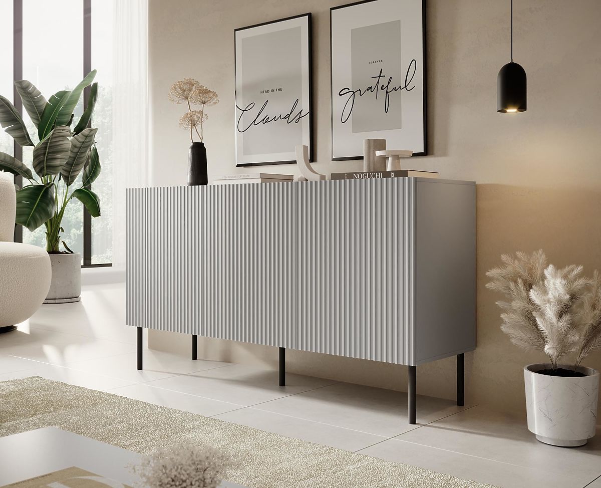 Svetlosivá komoda s čiernymi kovovými nohami. .. viac
