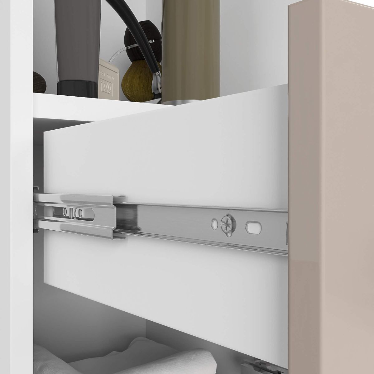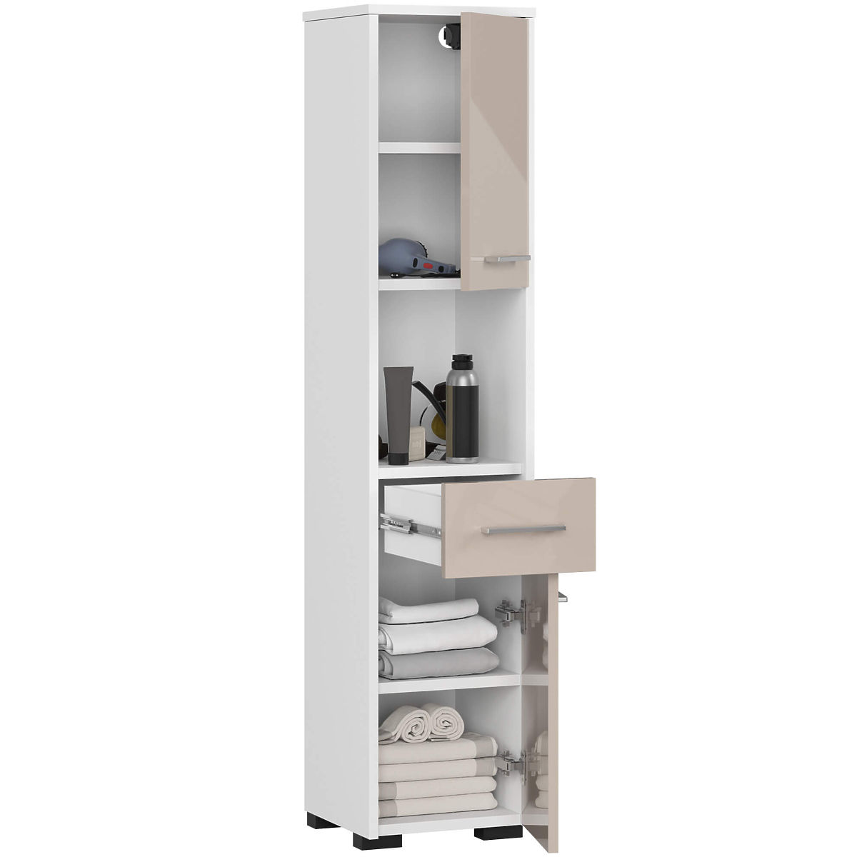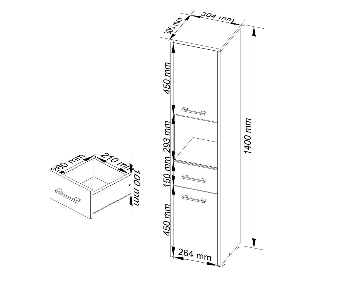 Regály sú veľmi funkčný nábytok, ktorý nájde uplatnenie v rôznych miestnostiach. Môžu byť úspešne umiestnené v kúpeľni. Stĺp kúpeľňový regál FIN 2D 1SZ 1W tvorí prvky z vysoko kvalitnej laminovanej dosky firmy kronospan 16 mm, zatiaľ čo na ich hranách sa nachádza ABS hrana. Vďaka tomu je skrinka vysoko odolná voči vlhkosti, oderu a mechanickému poškodeniu. V spodnej a hornej časti regálu sa nachádza skrinka uzatvárateľná dvierkami, ktorá je rozdelená policou. Môžu sa v nich uchovávať uteráky, posteľná bielizeň alebo chemické prostriedky. Strednú časť stĺpa zaberá výsuvná zásuvka. Je to ideálne miesto pre kozmetické drobnosti. Nad zásuvkou je priestranný otvorený priestor, ktorý možno využiť na uloženie kozmetiky väčších rozmerov. Dvierka regálu zdobia strieborné úchyty.