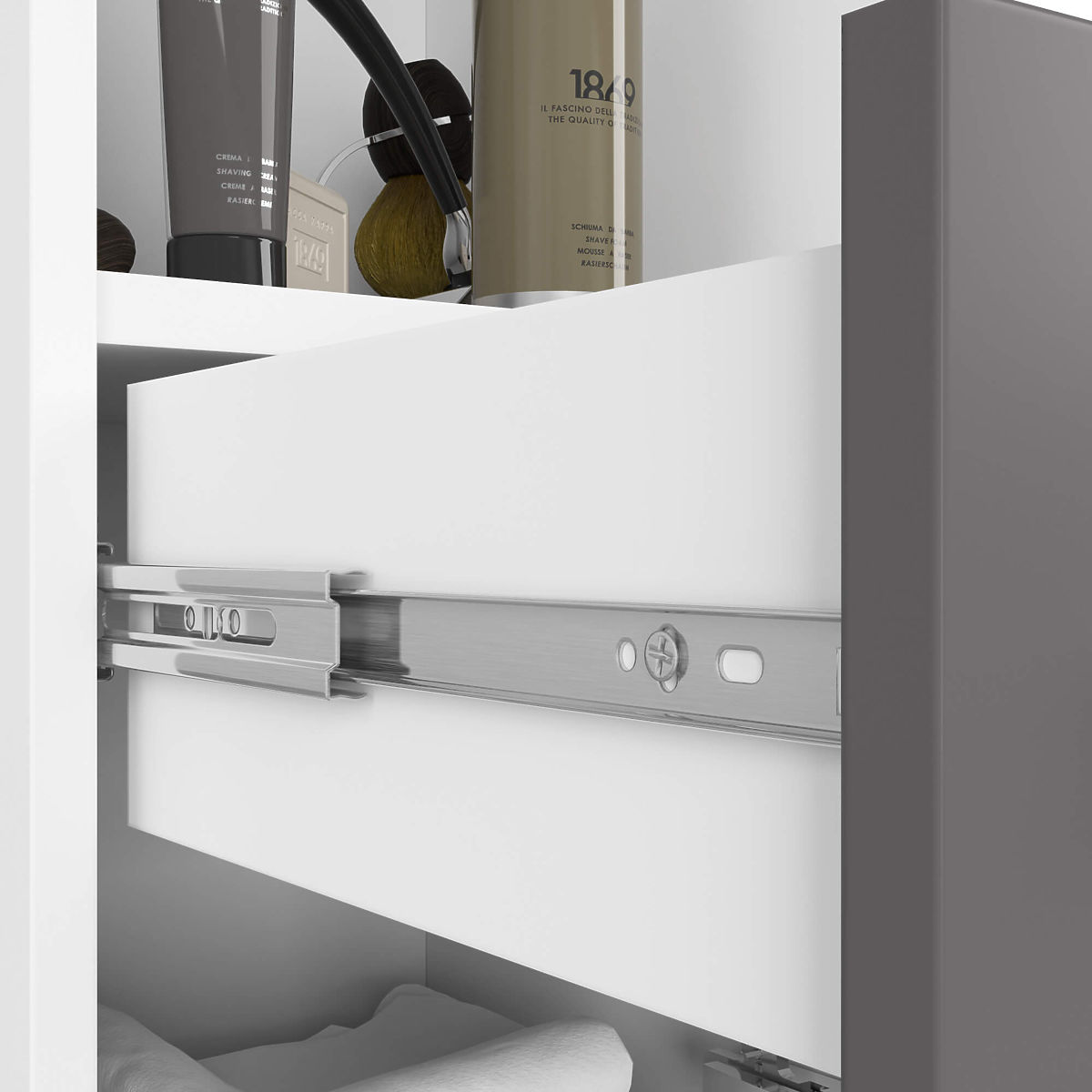 Kúpeľňová skrinka je vyrobená z najkvalitnejšej laminovanej dosky s hrúbkou 16 mm. Aby bol váš stĺp chránený pred akýmikoľvek nárazmi, jeho hrany sú olepené ABS hranou. Kúpeľňový regál stĺp je k dispozícii v módnej bielej/grafitovo šedej farbe. Rukoväte dvierok skrinky sú v univerzálnej striebornej farbe. Stojí za zmienku, že montáž tejto skrinky je veľmi jednoduchá a návod je priložený k baleniu.