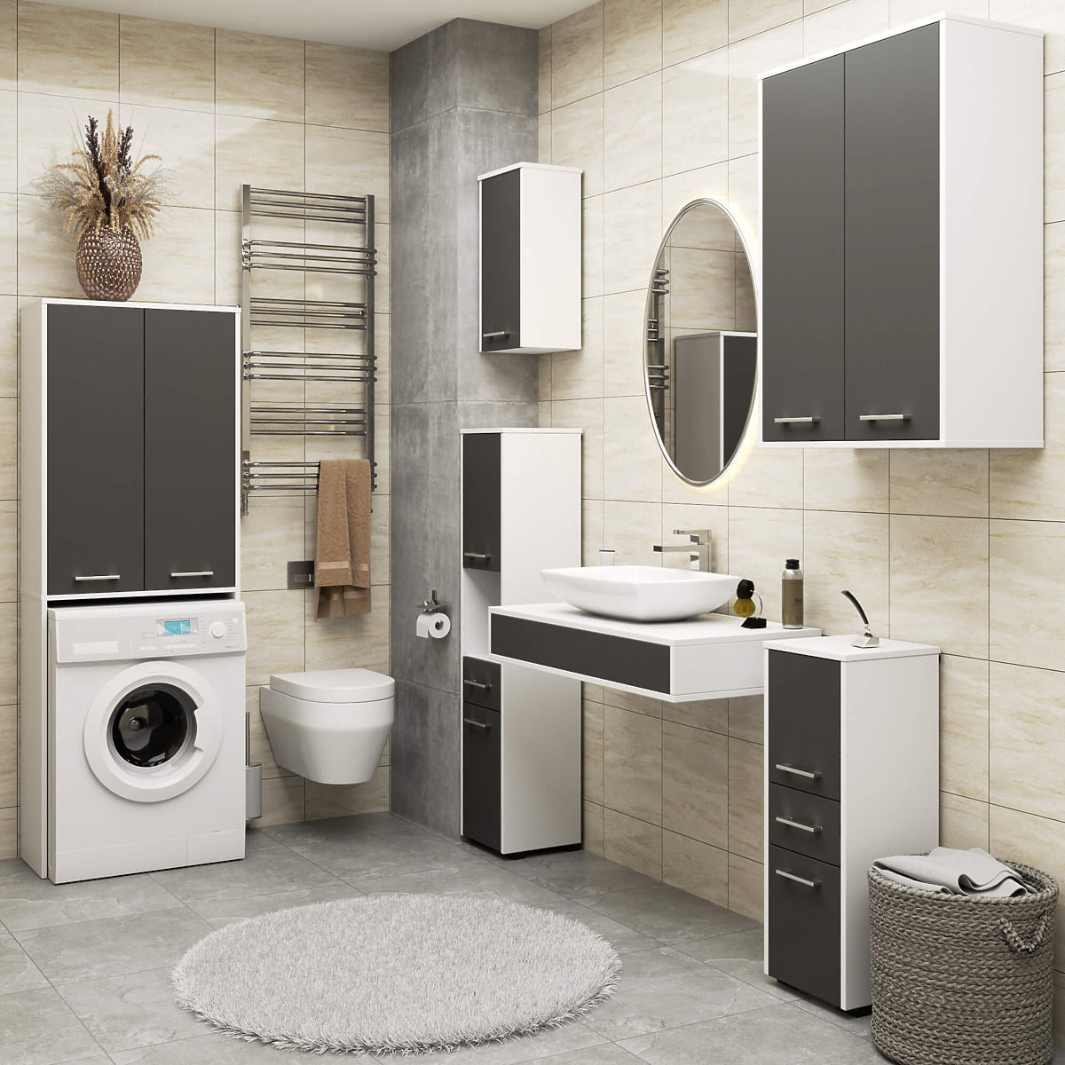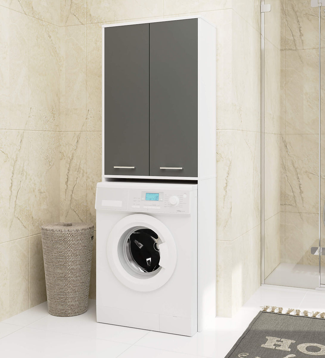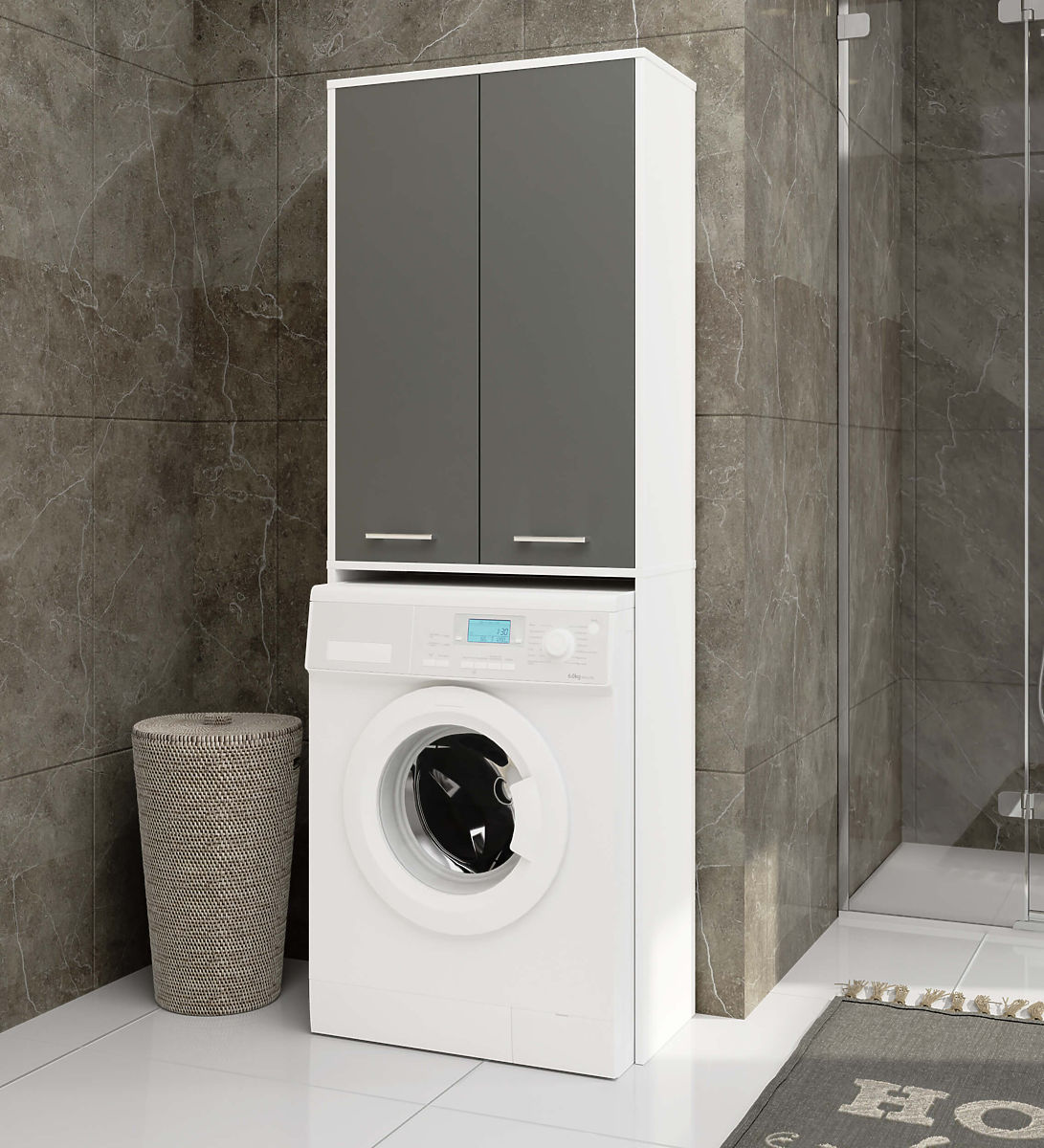 Ak chceme, aby naša kúpeľňa bola zariadená pohodlne a zároveň štýlovo, mali by sme sa zamerať na solídne a funkčne prevedený nábytok. Takým je určite skrinka nad práčku. Je to ideálny spôsob, ako využiť miesto nad práčkou, ktoré obvykle zostáva nevyužité. Optimálne rozmery tohto stĺpu z neho robia skvelé riešenie pre kúpeľne s malou plochou. Ergonomický tvar umožňuje jeho využitie v každej miestnosti. Tento nábytok, skladajúci sa z nadstavby nad práčku a skrinky nad ňou, vytvára veľké množstvo úložného priestoru pre rôzne predmety. V skrinke schováme napríklad detergenty alebo hygienické prostriedky. Tieto police sú určené na ukladanie osobnej kozmetiky alebo uterákov. Krásny odtieň bielej s grafitovo šedými čelami nám zaručuje elegantný vzhľad kúpeľne. Laminovaná doska, z ktorej je skrinka vyrobená, je vysoko kvalitný materiál. Zaisťuje trvanlivosť a pevnosť nábytku, rovnako ako zachovanie jeho estetického vzhľadu.