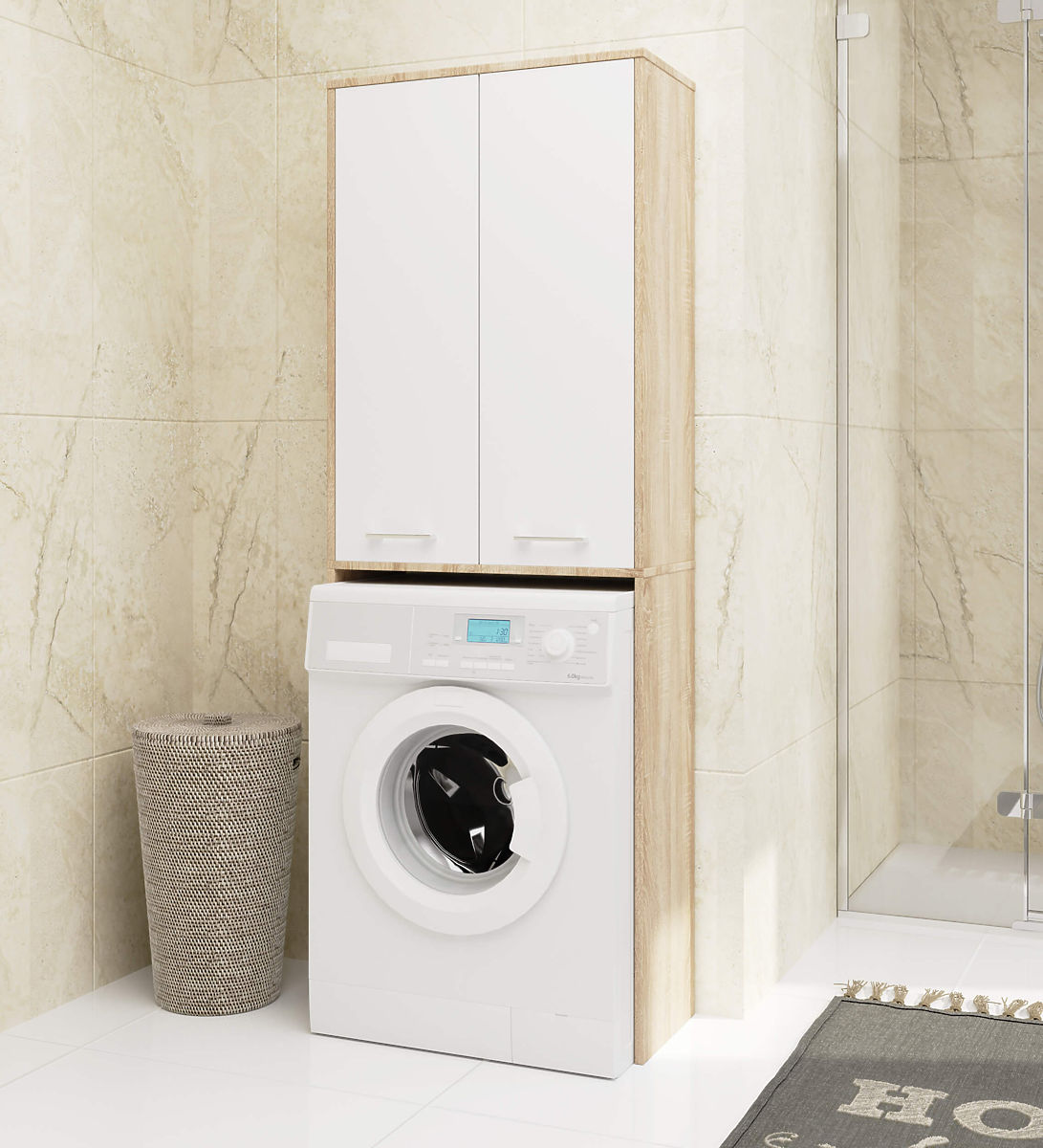 Ak chceme, aby naša kúpeľňa bola zariadená pohodlne a zároveň štýlovo, mali by sme sa zamerať na solídne a funkčne vyrobený nábytok. Takým je určite skrinka nad práčku. Je to ideálny spôsob, ako využiť priestor nad práčkou, ktorý zvyčajne zostáva nevyužitý. Optimálne rozmery tohto stĺpu z neho robia skvelé riešenie pre kúpeľne s malou plochou. Ergonomický tvar umožňuje jeho využitie v každej miestnosti. Tento nábytok, pozostávajúci z nadstavca nad práčku a skrinky nad ním, vytvára veľké množstvo úložného priestoru pre rôzne predmety. Do skrinky uložíme napríklad detergenty alebo hygienické prostriedky. Tieto police sú vytvorené pre uloženie osobnej kozmetiky alebo uterákov. Krásny odtieň, akým je dub sonoma s bielymi čelami, nám zaručuje elegantný vzhľad kúpeľne. Laminovaná doska, z ktorej je táto skrinka vyrobená, je vysoko kvalitný materiál. Zabezpečuje trvanlivosť a pevnosť nábytku, a tiež zachovanie jeho estetického vzhľadu.