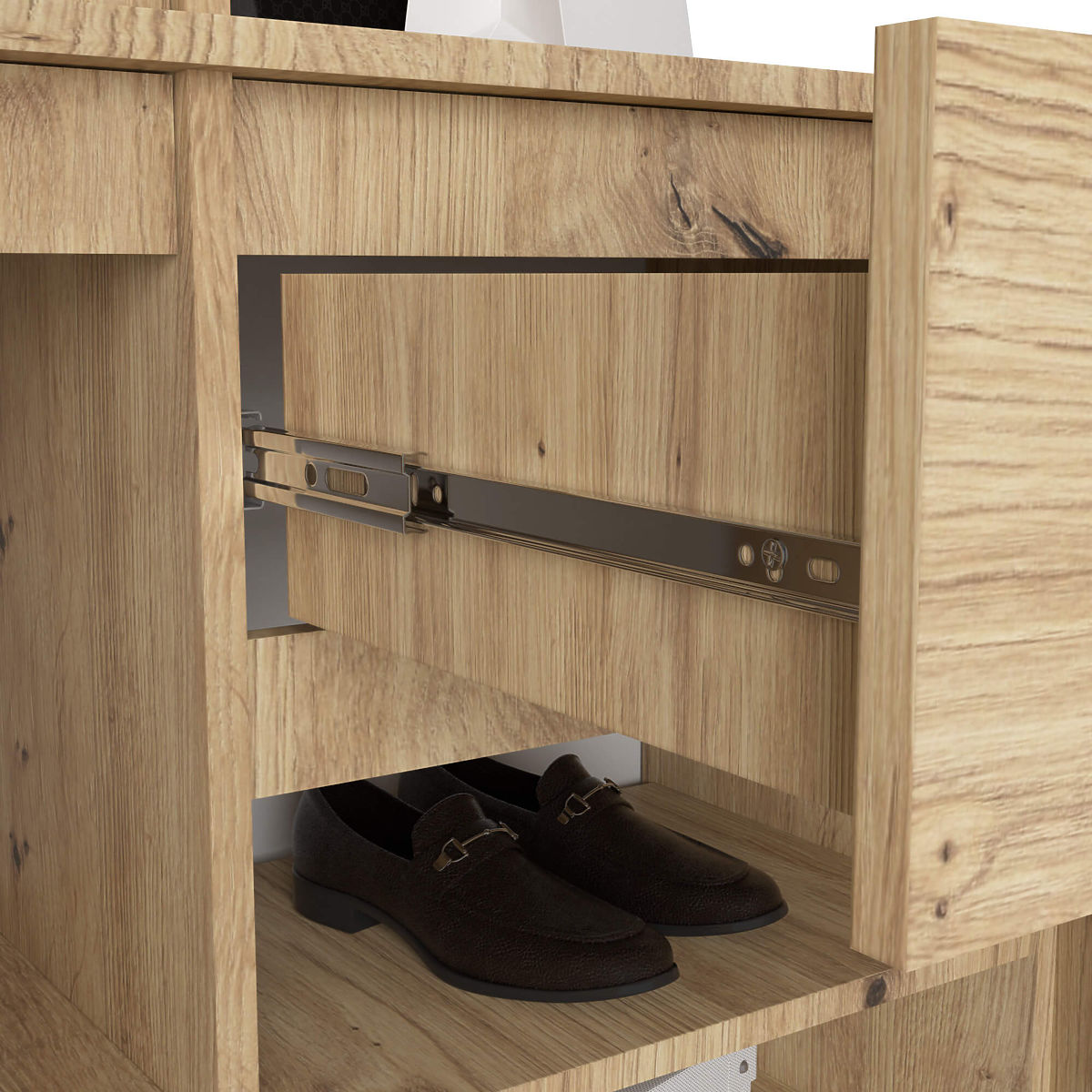 Skriňa do predsiene ENTRO je vybavená skrinkou so zrkadlom, dvoma menšími skrinkami s vnútornými policami, zásuvkou, 5 vešiakmi vo forme háčikov a ďalšou policou nad vešiakmi. Takéto usporiadanie robí nábytok multifunkčným a prekvapivo priestranným. V skrinke so zrkadlom je praktická tyč na zavesenie oblečenia. Otvorená polica je užitočná na odkladanie každodenných drobností. Plytká skriňa do predsiene nezaberá veľa miesta, takže ju možno úspešne umiestniť aj do malých a úzkych priestorov. Výzdobu elegantne doplní ďalší nábytok do predsiene z ponuky Fabryki Mebli AKORD.