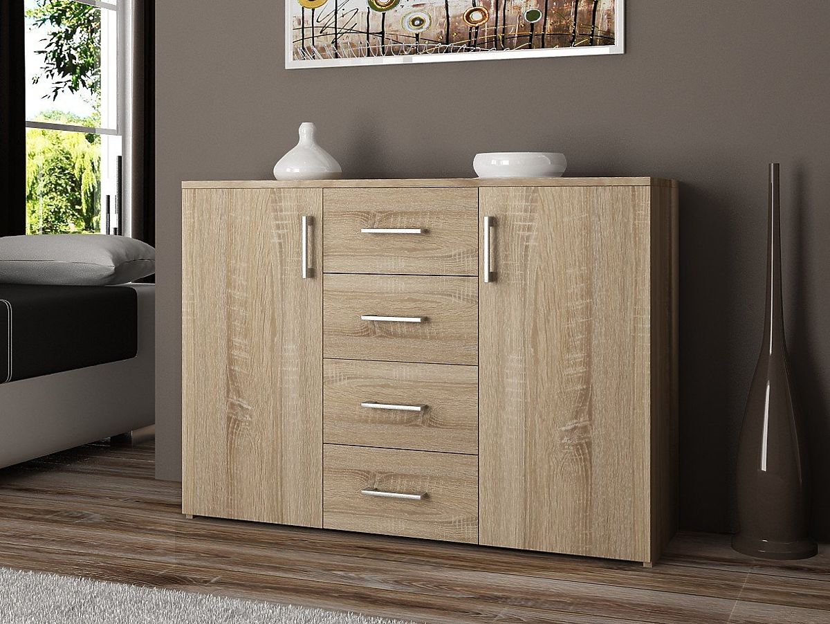 Komoda z laminovanej dosky vo farbe Dub Sonoma s ABS hranou a štyrmi zásuvkami. .. viac