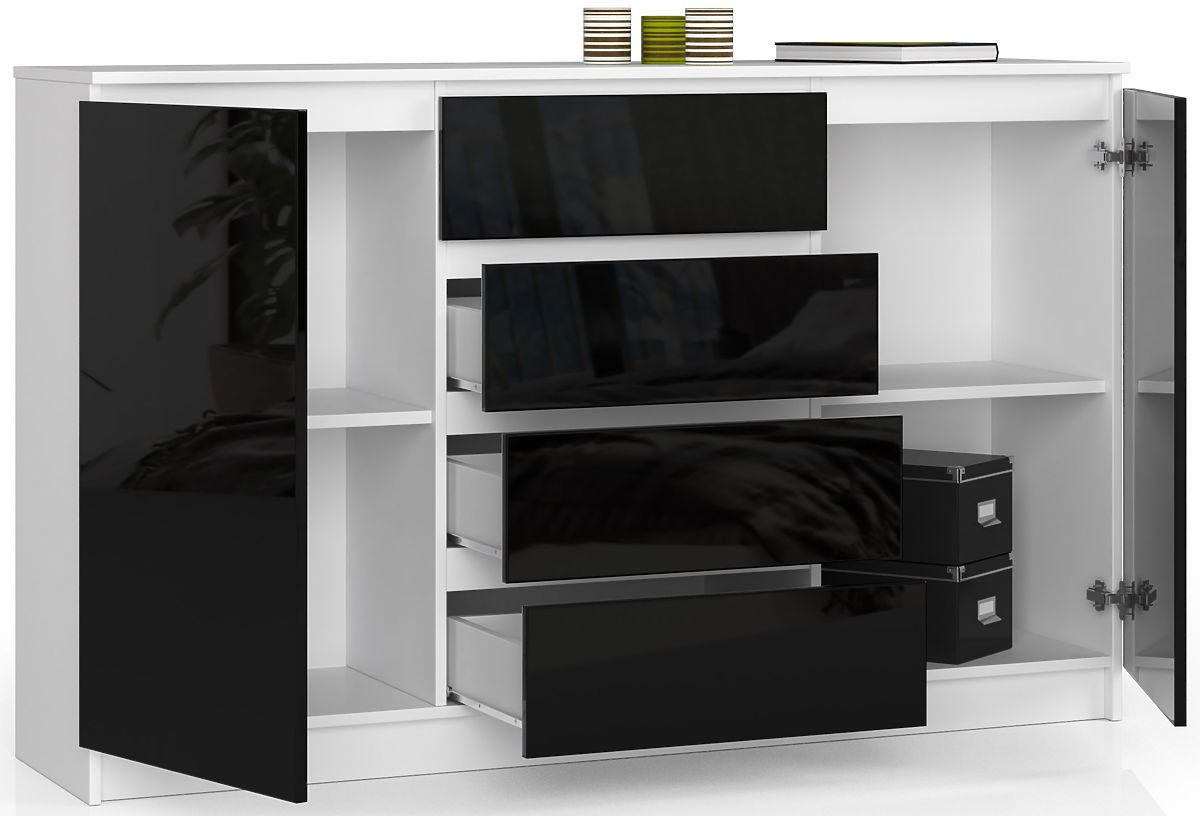 Korpus komody je vyrobený z laminovanej dosky 16mm biely polomat, čelá sú vyrobené z AKRYL dosky dekor Čierny 19mm vysoký lesk.