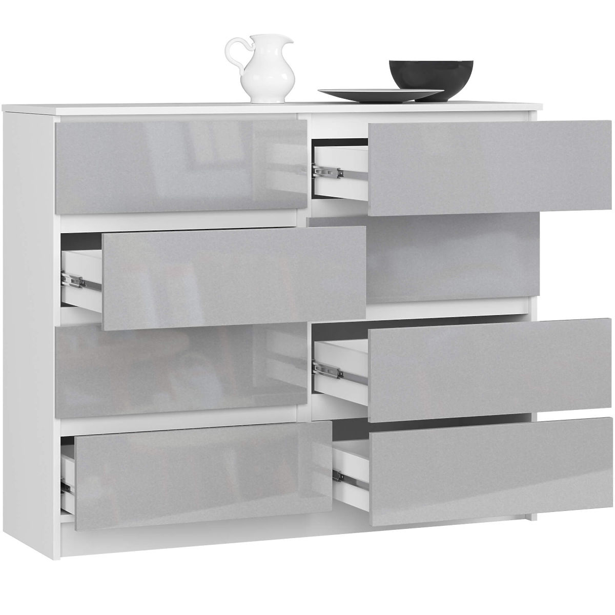 Ponúkame veľkú komodu s 8 zásuvkami. Komoda má biely polomatný korpus vyrobený z laminovanej dosky o hrúbke 16 mm, ktorá je veľmi odolná proti oderu. Čelá sú vyrobené z MDF dosky s akrylovým povlakom o hrúbke 19 mm, ktorý sa vyznačuje vysokou trvanlivosťou a je odolný proti vyblednutiu vplyvom intenzívneho slnečného svetla. Hrany sú opatrené ABS hranou, ktorá zabezpečuje vysokú ochranu proti mechanickému poškodeniu a oderu. Zásuvky bez úchytiek majú modernú farbu metalik s vysokým leskom. Zásuvky sú vedené na kovových guľôčkových pojazdoch. Komoda má jednoduchý a zároveň veľmi univerzálny vzhľad. Dokonale sa hodí do každého interiéru, bude vyzerať rovnako dobre v obývacej izbe, spálni alebo dokonca v kancelárii. Vďaka veľmi priestranným a objemným zásuvkám bude v každej miestnosti poriadok. K tomuto modelu komody je možné úspešne zladiť ďalší nábytok zo série CLP.