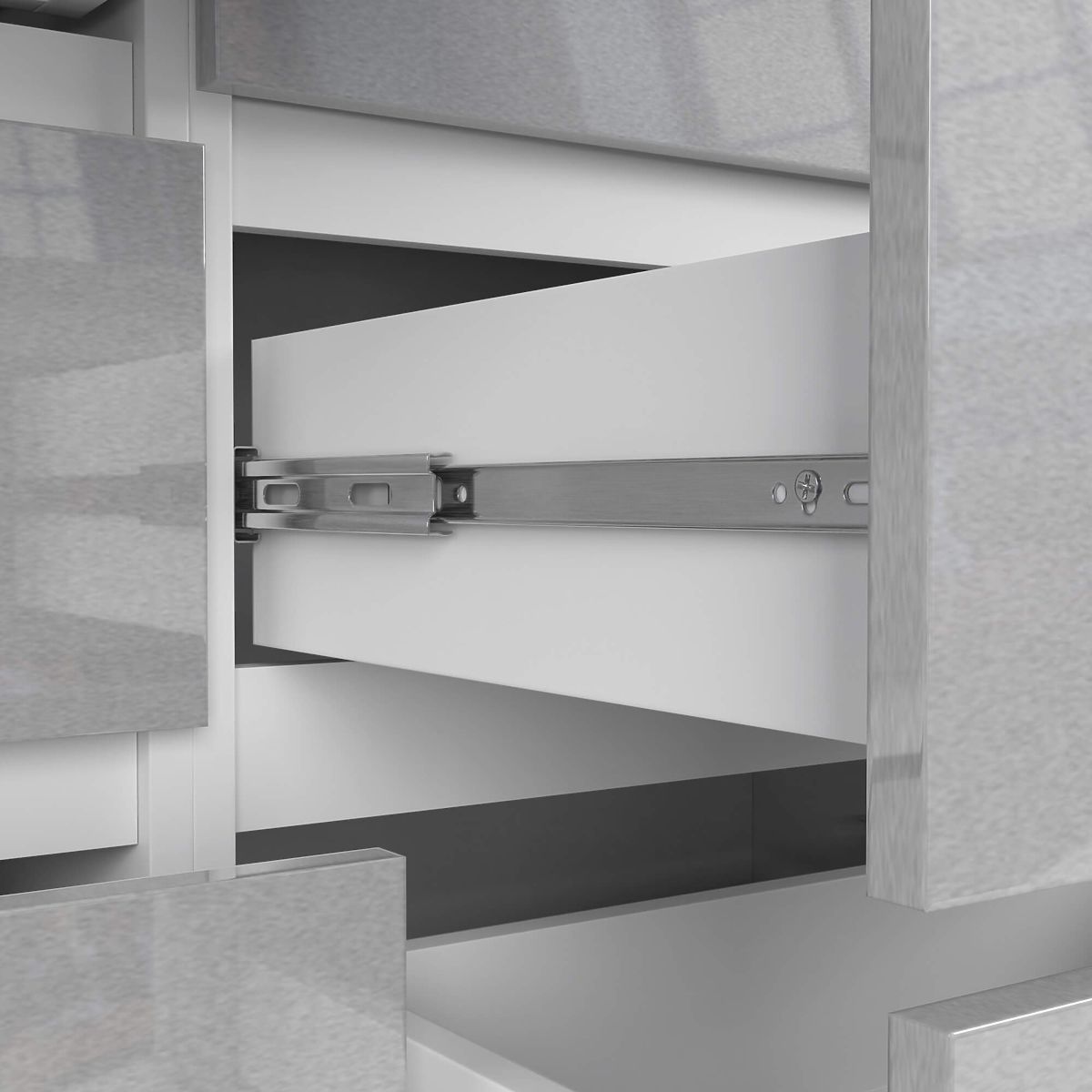 - Zásuvky sa pohybujú na kovových guľôčkových pojazdoch