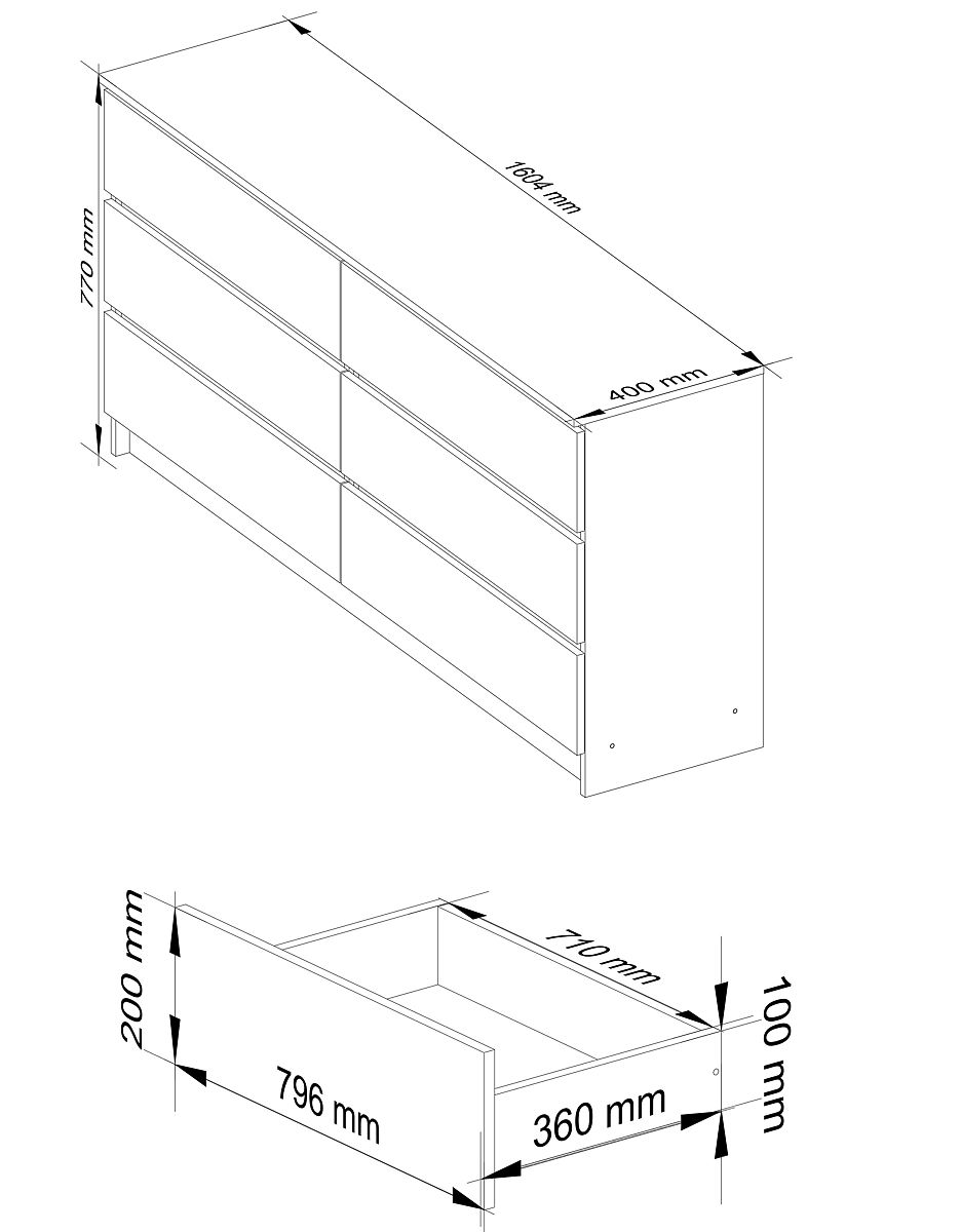 - Korpus komody vyrobený z laminovanej dosky biely mat 16mm odolnej proti oderu