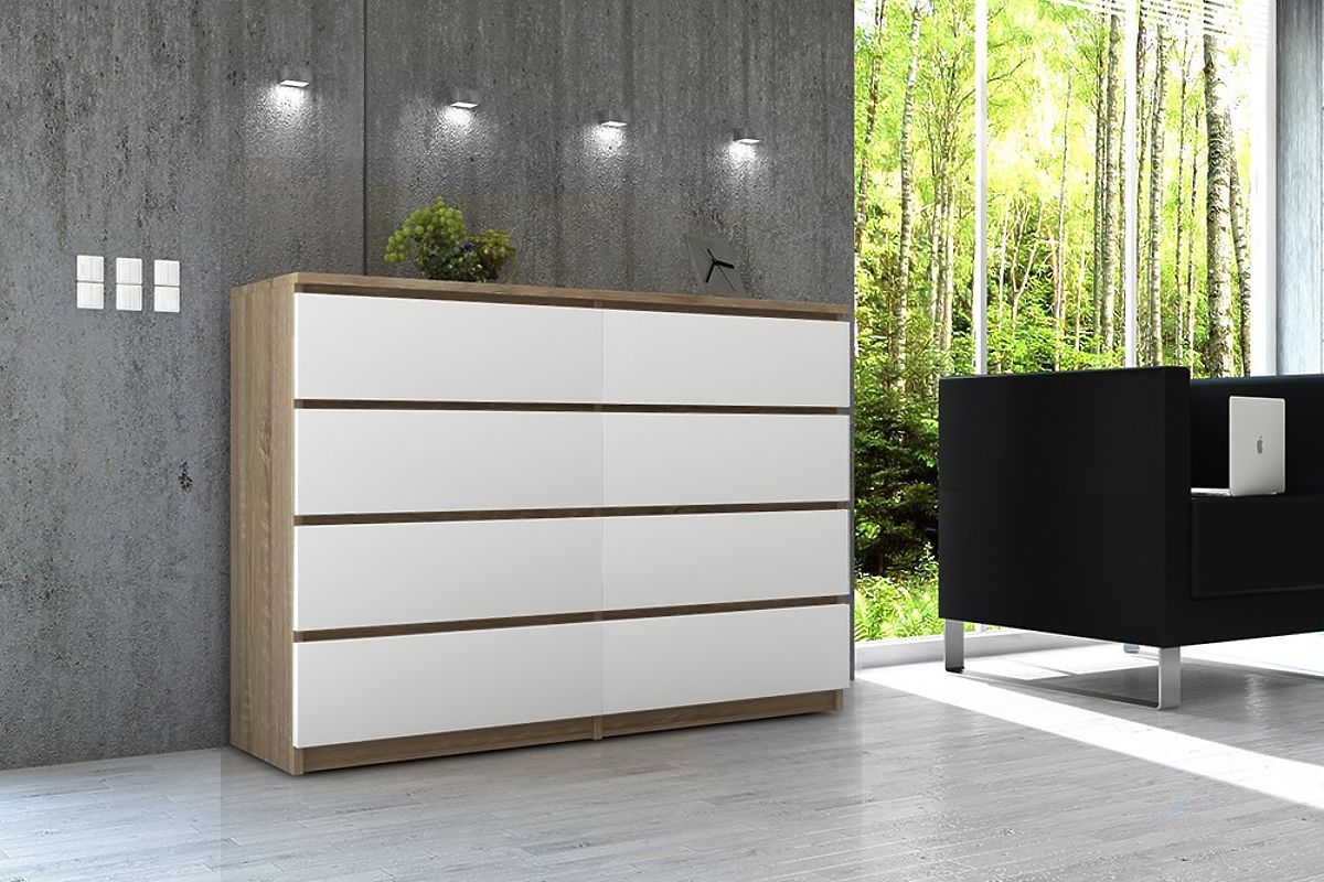 Krásna, moderne navrhnutá komoda, ktorá môže byť úspešne využitá v obývacej izbe, spálni alebo jedálni, je produkt vysokej kvality. Nábytok je vyrobený z laminovanej dosky o hrúbke 16 milimetrov, odolnej proti oderu, odolný a krásne sa prezentujúci v každom interiéri. Hrany komody sú olepené ABS hranou. Biele čelá sa dokonale hodia k súčasným trendom a zvláštnu pozornosť si zaslúži pevná konštrukcia nábytku, ktorý je vybavený ôsmimi priestrannými zásuvkami. Zásuvky sa pohybujú na kovových guľôčkových pojazdoch a celý nábytok je určený na samostatnú montáž. Je to ponuka pre tých, ktorí chcú ísť s duchom doby, a zároveň si vyberajú nábytok dostupný v nadčasovej, univerzálnej farebnosti. Komodu je možné kombinovať s iným nábytkom v rovnakom štýle, ktorý je tiež súčasťou našej ponuky. Odporúčame sa bližšie zoznámiť s naším bohatým sortimentom dostupným za výhodnú cenu.