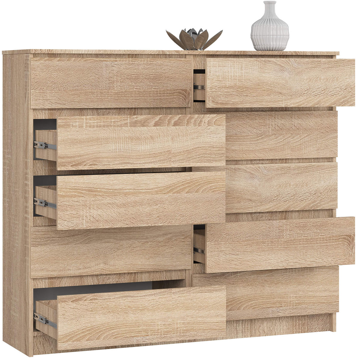 Solídny nábytok z našej ponuky je obľúbený medzi zákazníkmi, ktorí preferujú klasický minimalizmus. Predstavovaná komoda K140 zaujme jednoduchým tvarom, univerzálnou farebnosťou (dub sonoma) a praktickými riešeniami. Zameriavame sa predovšetkým na kvalitu, ponúkame nábytok vyrobený z odolných a kvalitných materiálov. Náš odporúčaný model vybavený desiatimi zásuvkami sa veľmi dobre hodí do obývacej izby, spálne alebo kancelárie, ale aj do mnohých ďalších miestností, ktoré chcete zariadiť módnym a funkčným spôsobom. Dobrá kvalita za nízku cenu určite poteší priaznivcov moderných riešení. Odporúčame tiež zoznámiť sa s ďalšími kusmi nábytku z tejto kolekcie - všetky komody sa vyznačujú solídnym spracovaním a odolnými materiálmi, z ktorých sú vyrobené.