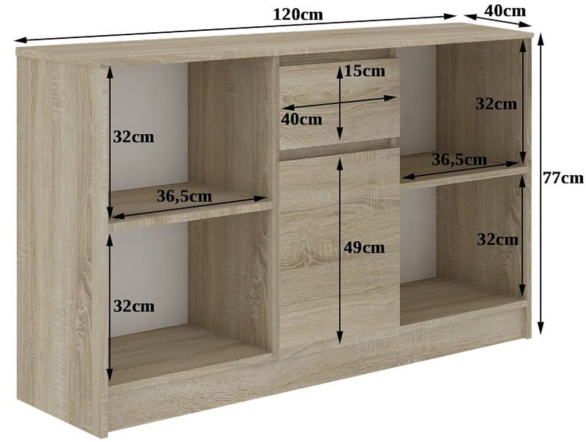 Rozmery nábytku sú 120 cm x 77 cm x 40 cm. Všetky osoby, ktoré hľadajú atraktívnu, kvalitnú, ale aj cenovo výhodnú možnosť pre zariadenú miestnosť, pozývame k bližšiemu zoznámeniu s touto zaujímavou ponukou. Dúfame, že splní očakávania aj tých najnáročnejších osôb. Komoda sa skladá z dvoch otvorených políc, jednej za dvierkami a jednej zásuvky. Celok sa krásne prezentuje samostatne aj v kombinácii s iným nábytkom z tejto série. Pozývame vás k nákupu.