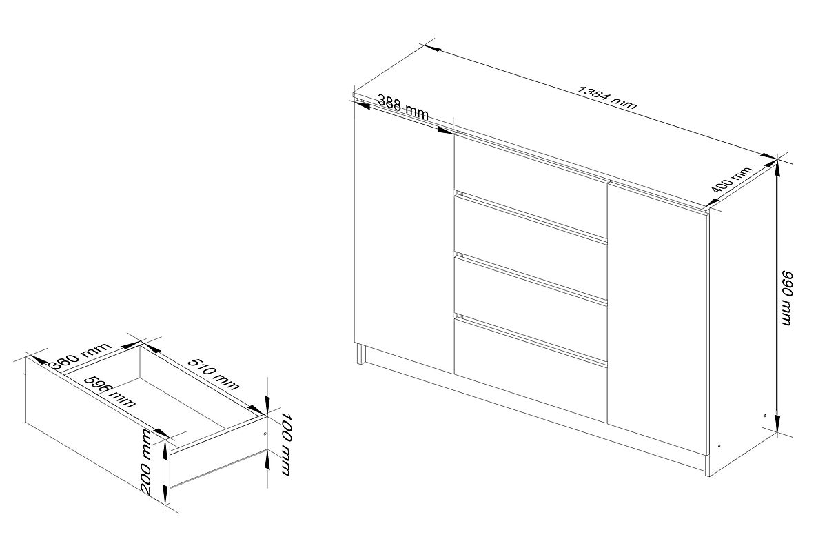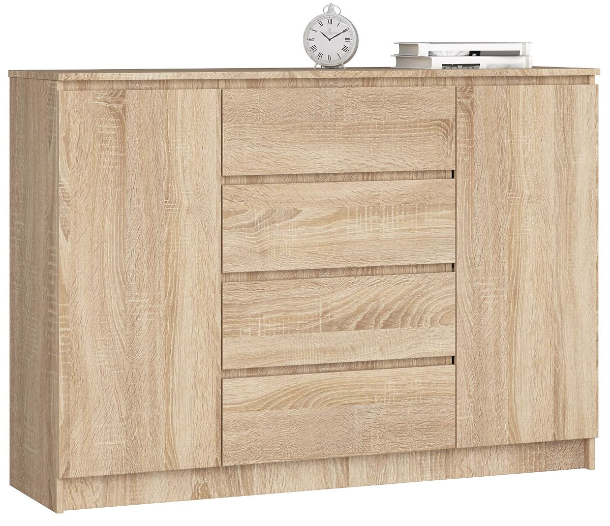 Veľká, priestranná a funkčná komoda je obľúbeným nábytkom, najmä v miestnostiach ako je obývačka alebo spálňa. Predstavujeme komodu K140 s rozmermi 99 cm na výšku, 138 cm na dĺžku a 40 cm na hĺbku, ktorá je vyrobená z laminovanej dosky s hrúbkou 16 mm od výrobcu Kronospan. Vďaka tomu je odolná proti oderu. Hrany sú tiež riadne chránené ABS hranou. Nábytok má 4 zásuvky, ktoré sa hladko pohybujú vďaka kovovým guľôčkovým pojazdom, a dve skrinky. Vo vnútri každých dvierok je jedna polička. Nábytok je v farbe sonoma, čo je mimoriadne elegantná a štýlová farba. Komoda má jednoduchý tvar a univerzálny charakter, takže sa skvele hodí do miestností s rôznymi štýlmi a aranžmánmi. Je trvanlivá, priestranná a pohodlná na používanie.