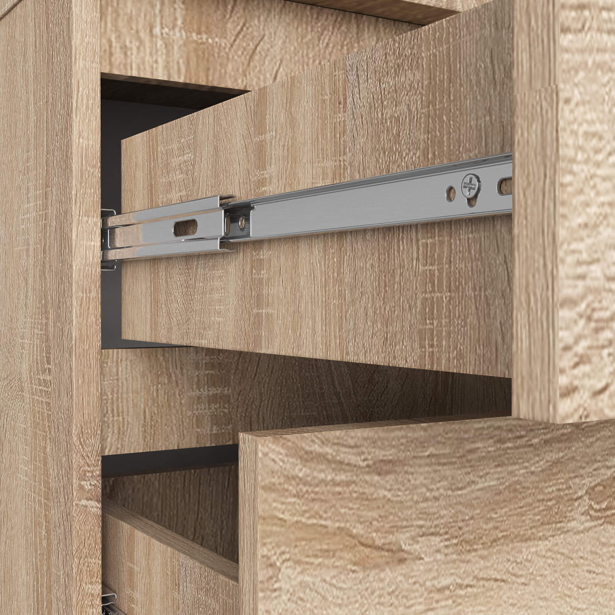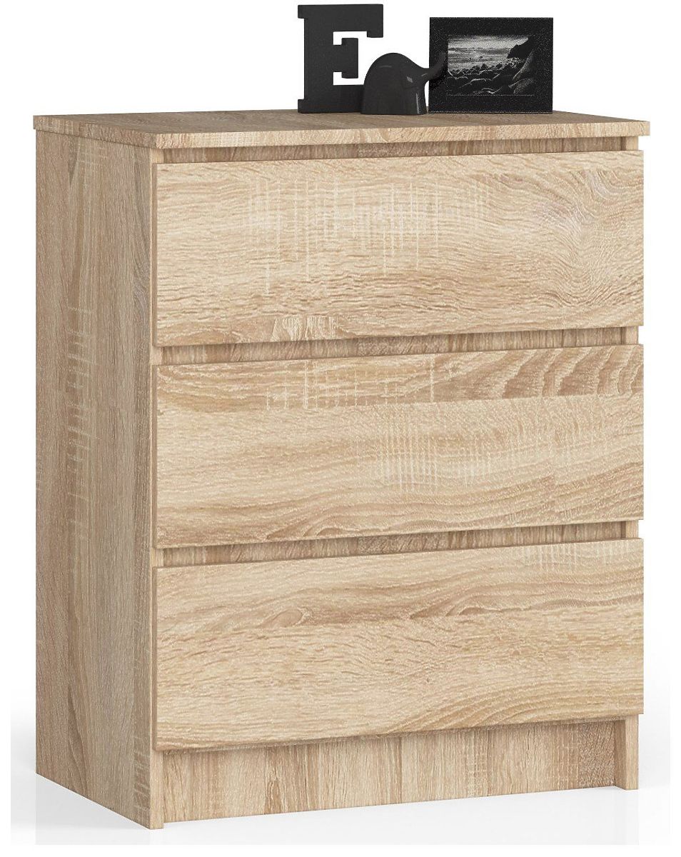 Malá, ale priestranná komoda s tromi zásuvkami, ktorej povrchová úprava splní očakávania náročných zákazníkov. Použitý bol dub sonoma, farba, ktorá sa dokonale hodí k svetlým interiérom. Produkt je vhodný do spálne, obývacej izby, izby alebo predsiene - všetko záleží na potrebách našich zákazníkov. Ponúkame kus vyrobený z laminovanej dosky o hrúbke až 16 milimetrov. Je to materiál odolný proti oderu, ktorý je navyše posilnený ABS hranou. Model využíva zásuvky pohybujúce sa na kovových guľôčkových pojazdoch, čo zaisťuje plynulý, jemný a presný chod.