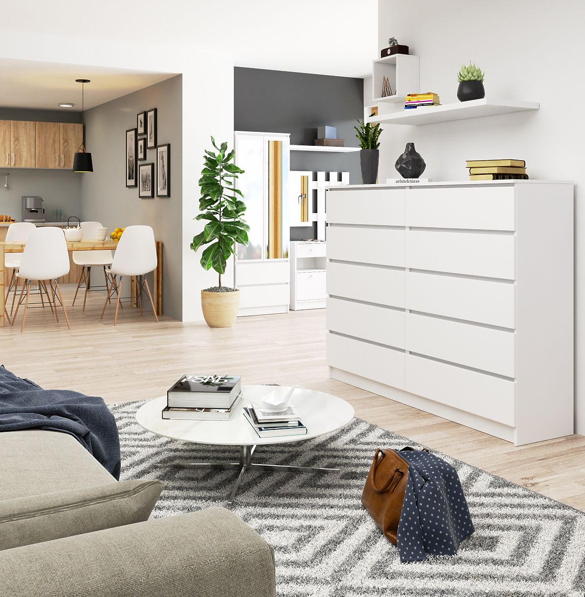 Komoda je vybavená desiatimi priestrannými zásuvkami, ktoré pojmú všetky potrebné predmety. Univerzálna a nadčasová biela farba umožňuje kombinovať komodu s rôznymi druhmi nábytku v rôznych farebných odtieňoch. Produkt je vyrobený z laminovanej dosky o hrúbke 16 milimetrov odolnej proti oderu. Hrany sú olepené ABS hranou.