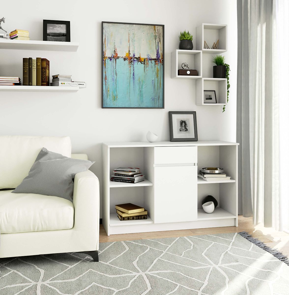 Biela komoda pochádzajúca zo sady B-17 môže slúžiť ako samostatný, nezávislý prvok vybavenia každej miestnosti. Vďaka modulárnej konštrukcii ju možno skombinovať s iným segmentom sady a vytvoriť pohodlný rohový stôl (ďalšie prvky vo forme stola k zakúpeniu v našom obchode). Stredná časť komody obsahuje jednu zásuvku a uzatvárateľné dvierka, ktoré umožňujú voľné ukladanie. Navyše má štyri samostatné, symetrické police s veľkým množstvom miesta na vystavenie. Komoda o dĺžke 120 cm, výške 77 cm je vyrobená z laminovanej dosky. Komoda bola navrhnutá tak, aby sa hodila do väčšiny miestností. Môže byť zaujímavým prvkom interiéru obývacej izby, plniť úlohu funkčného nábytku na ukladanie vecí v spálni, hodí sa aj ako ďalší segment kuchyne. Vďaka neutrálnej bielej farbe a minimalistickému dizajnu sa stane atraktívnym a predovšetkým funkčným doplnkom každého interiéru.